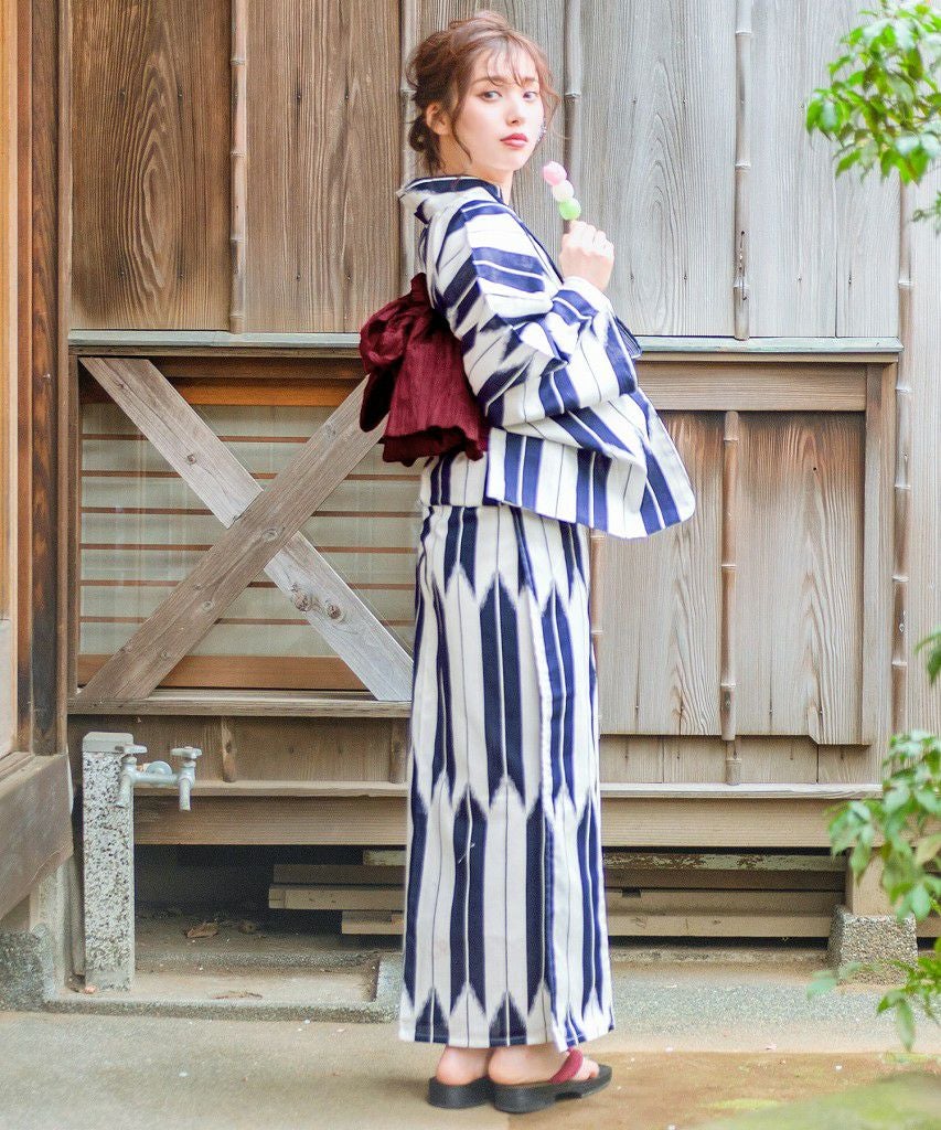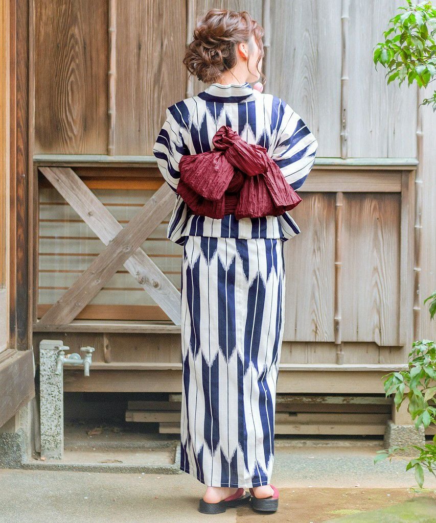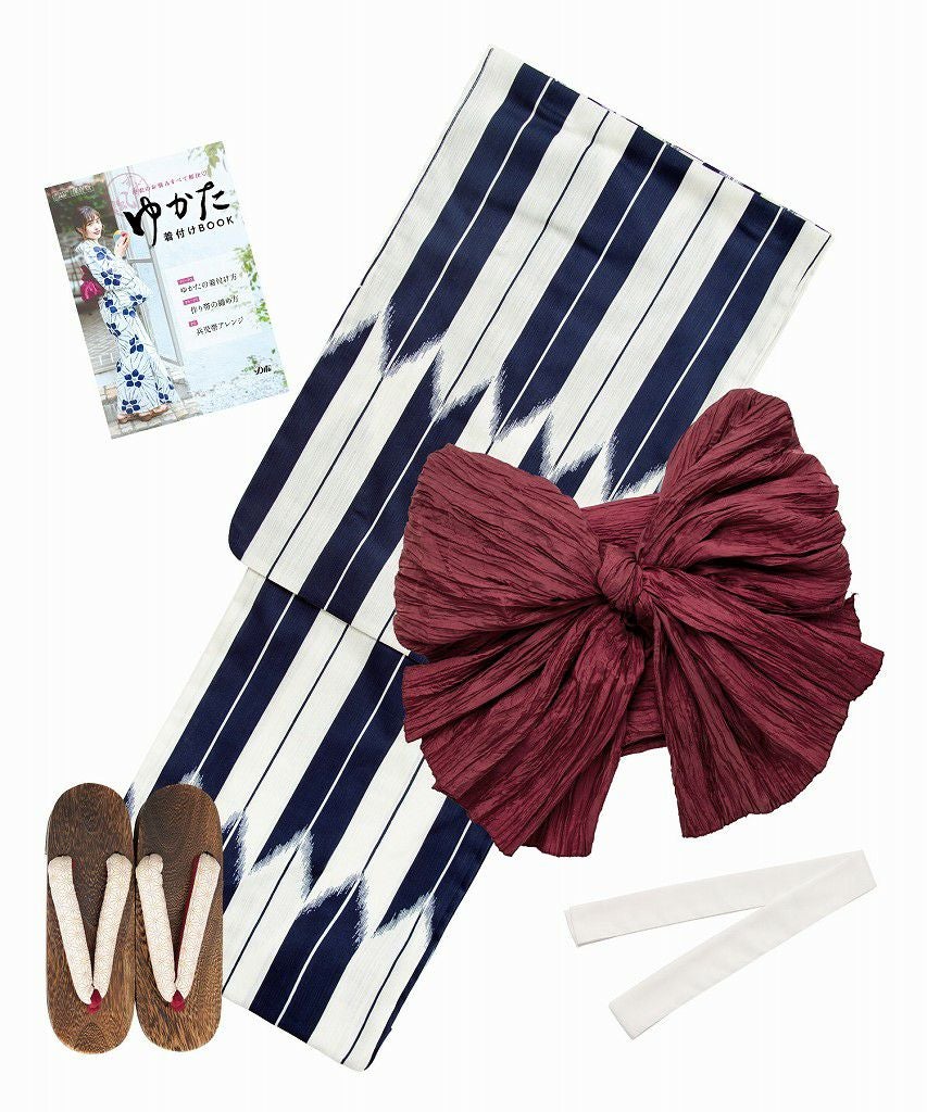 浴衣5点セット(ゆかた・帯・下駄・着付けマニュアル・腰ひも) 和調の矢絣ならべ