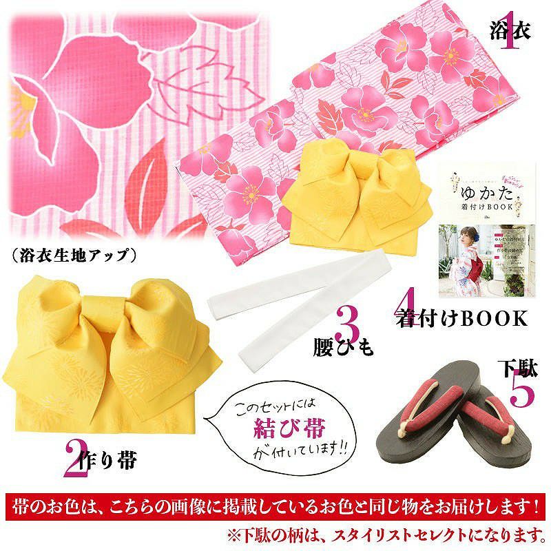 浴衣5点セット(ゆかた・作り帯・下駄・着付けマニュアル・腰ひも) 恋のツバキ模様
