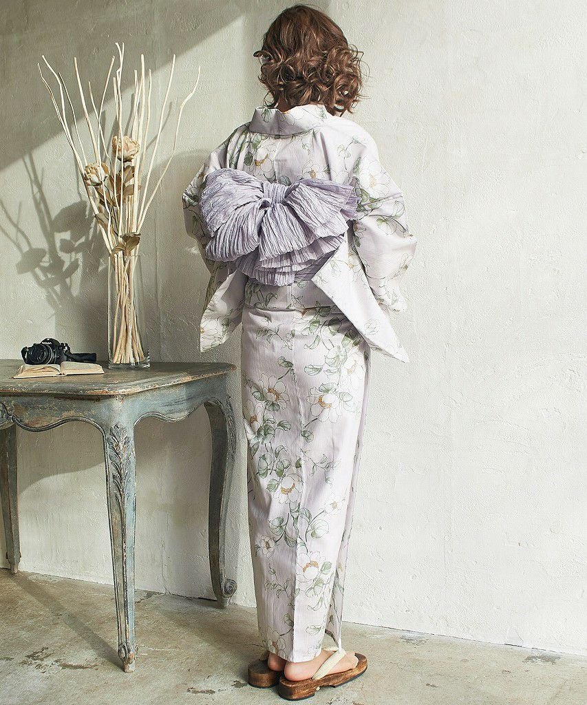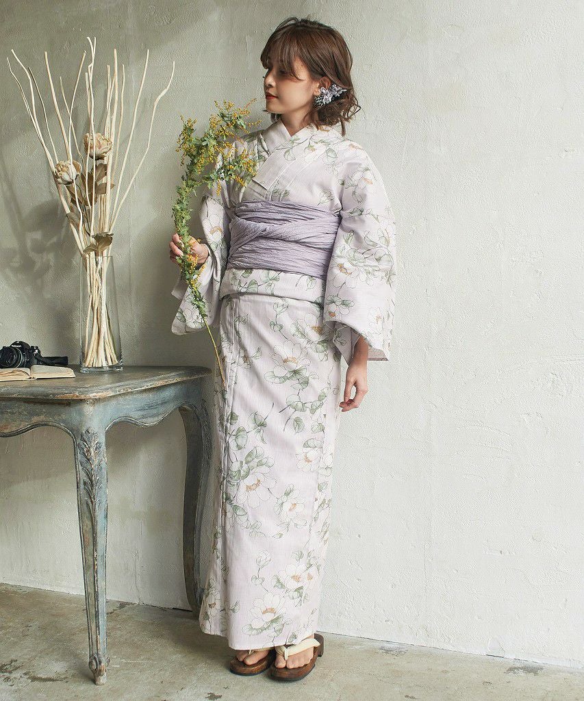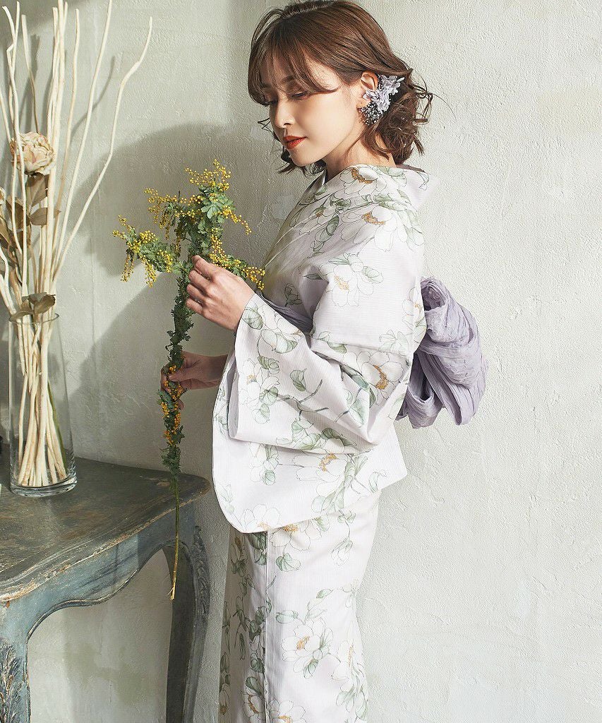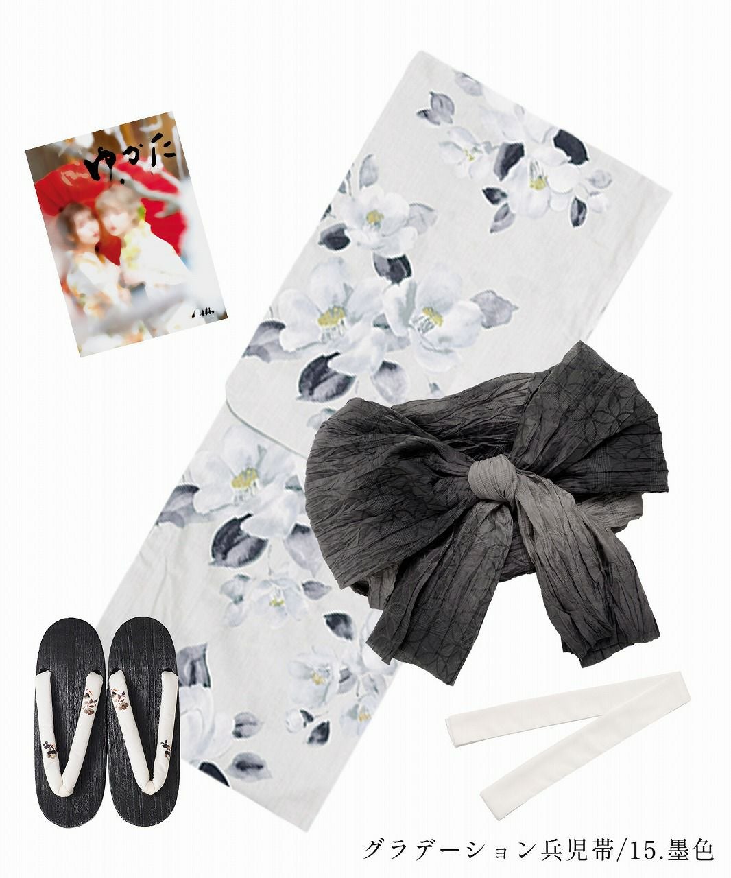 浴衣5点セット(ゆかた・帯・下駄・着付けマニュアル・腰ひも) 薄鈍色の椿ちらし