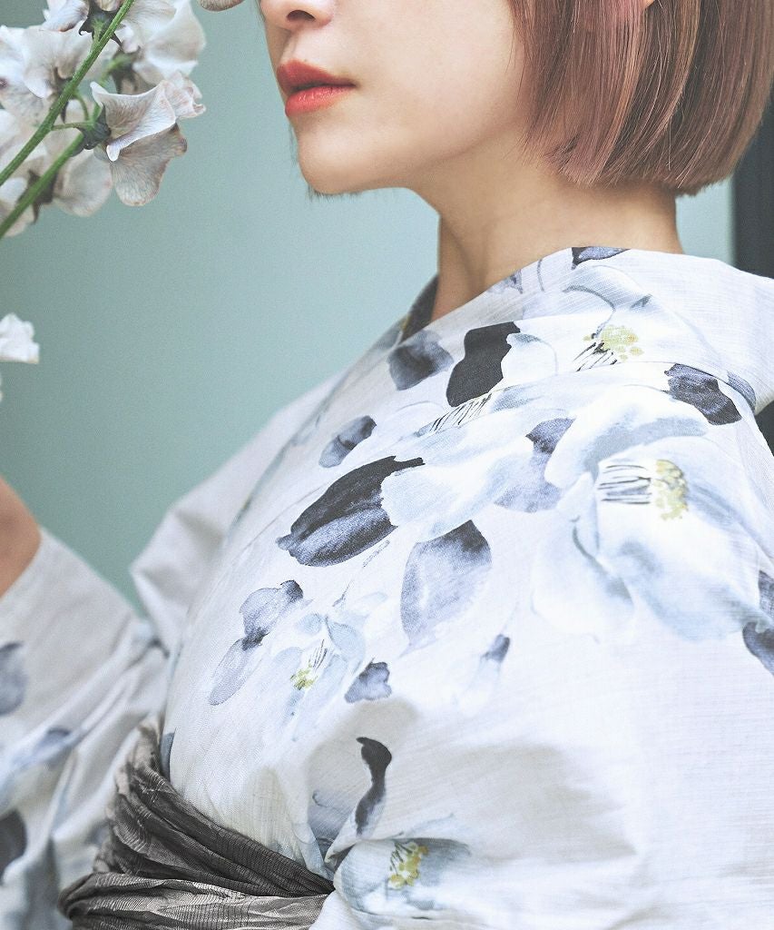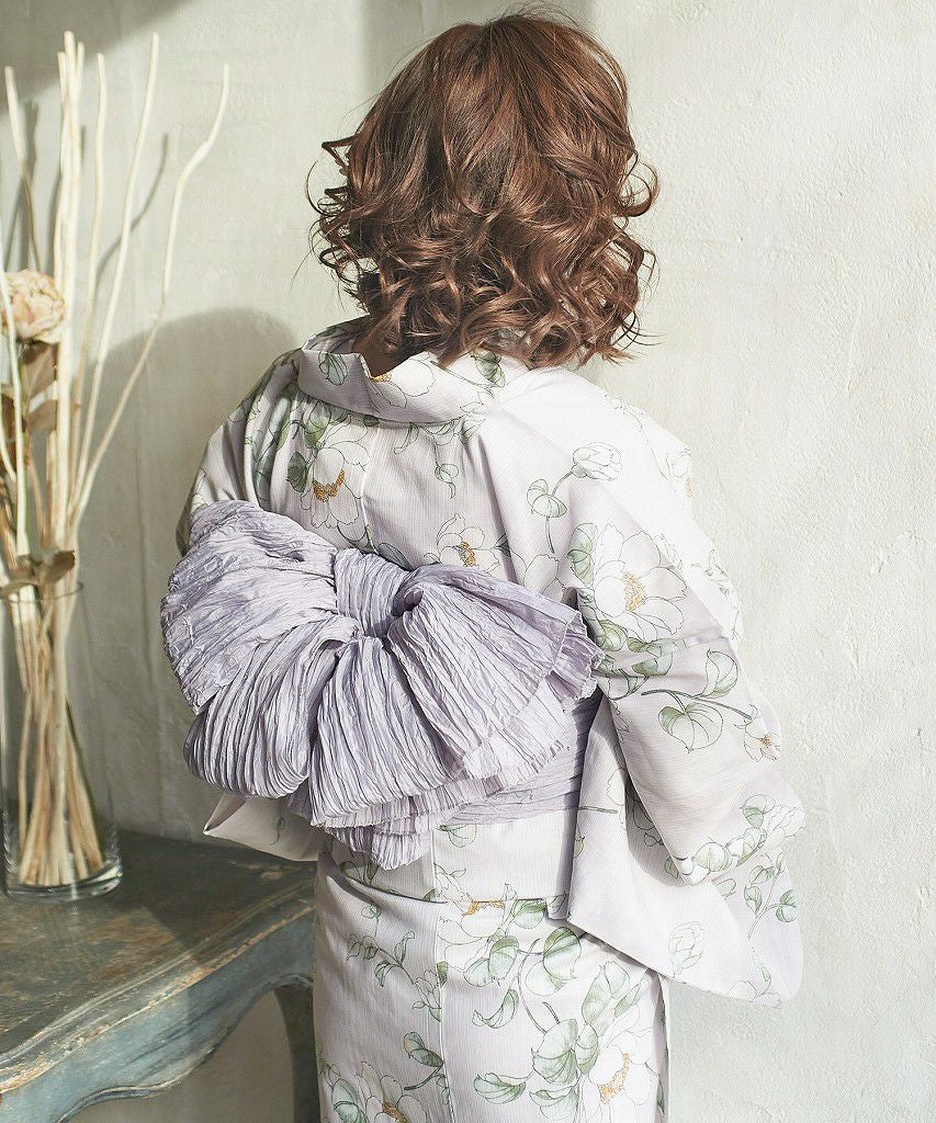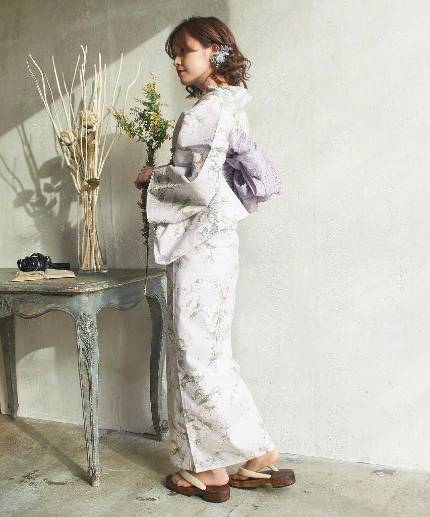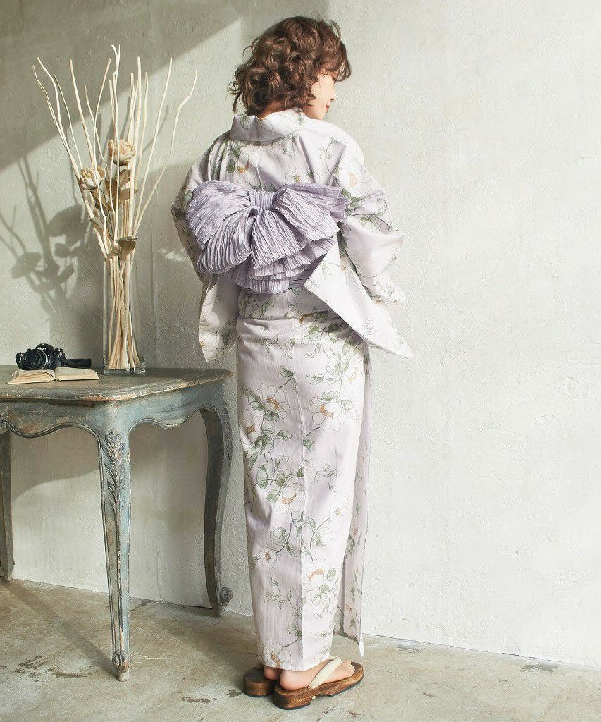 浴衣5点セット(ゆかた・帯・下駄・着付けマニュアル・腰ひも) 薄鈍色の椿ちらし