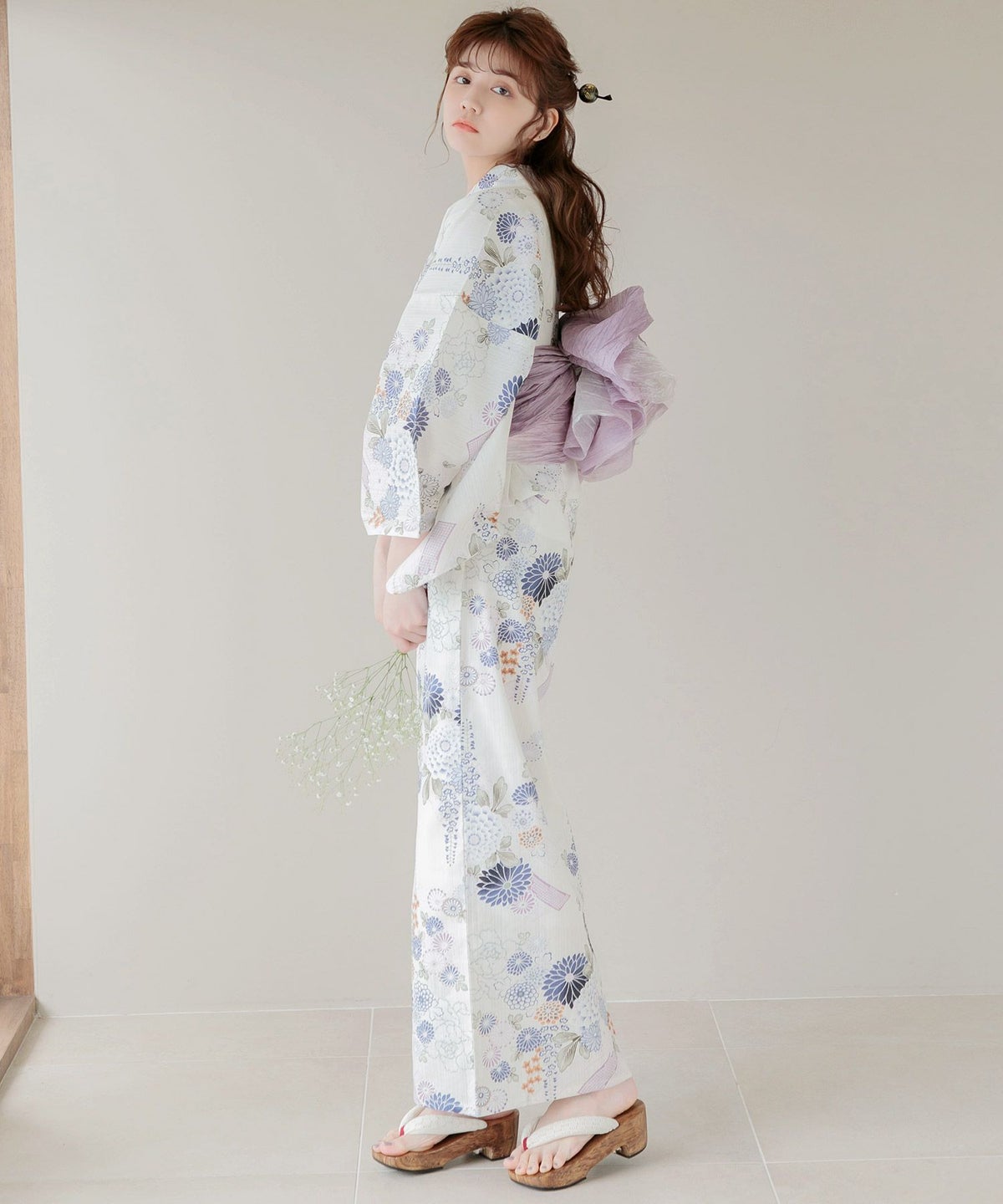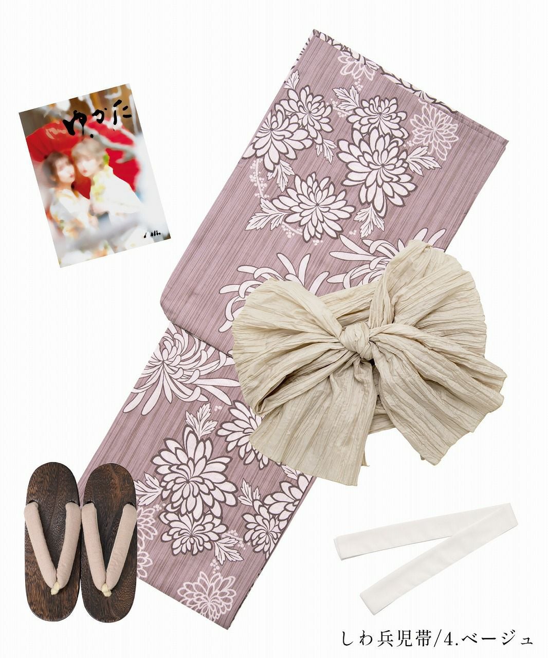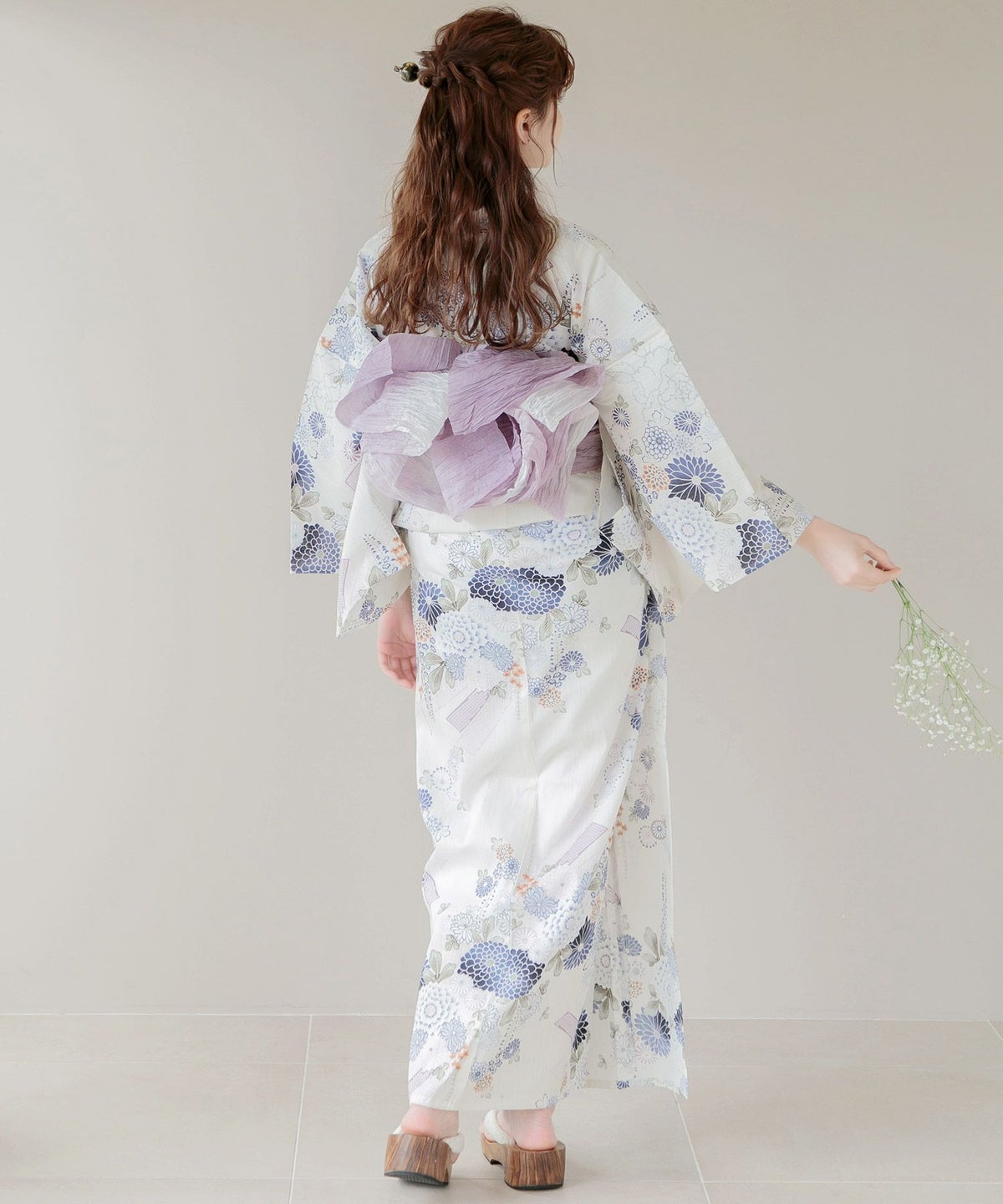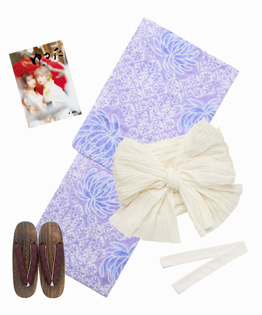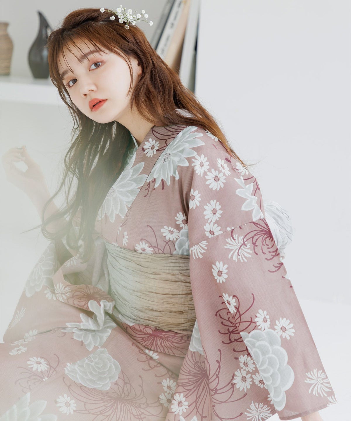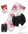 浴衣5点セット(ゆかた・帯・下駄・着付けマニュアル・腰ひも) 梅見月の菊ちらし