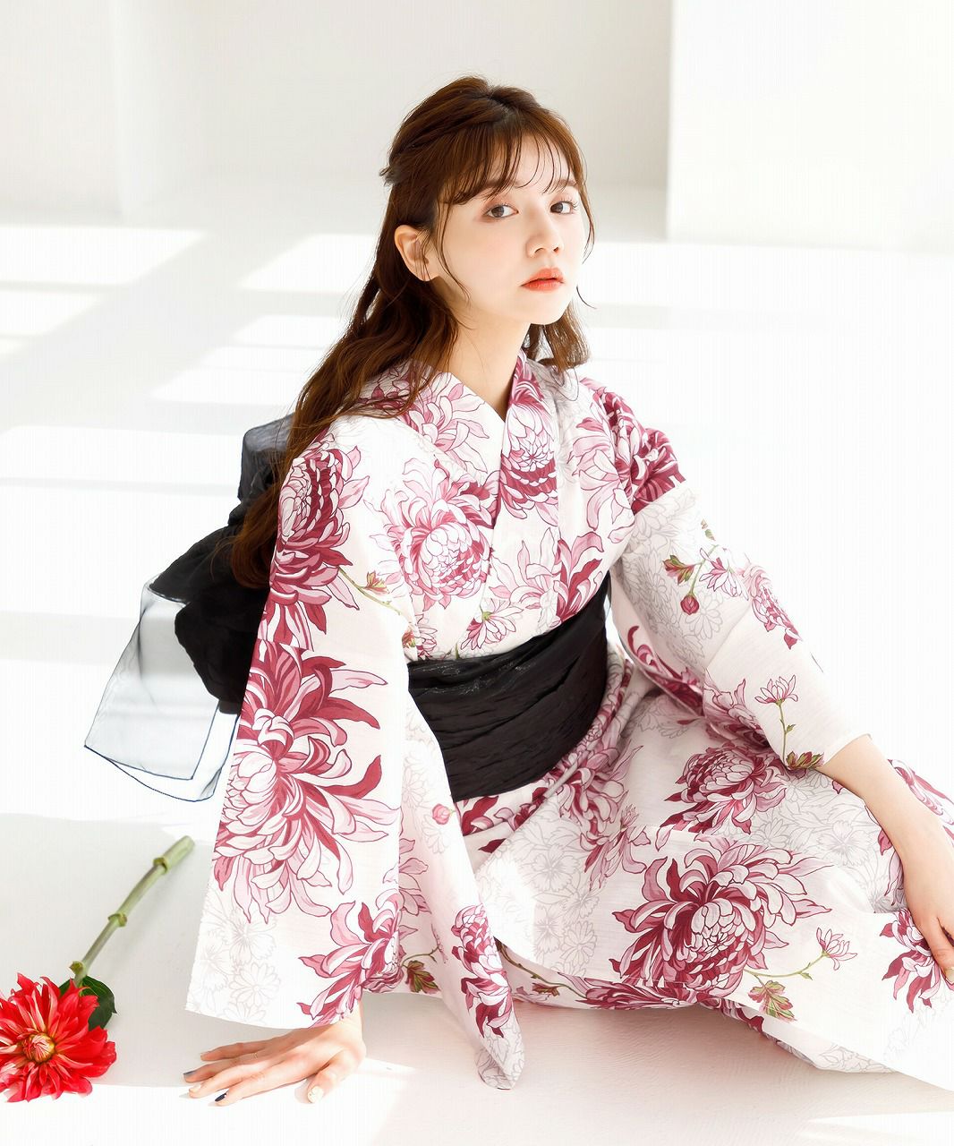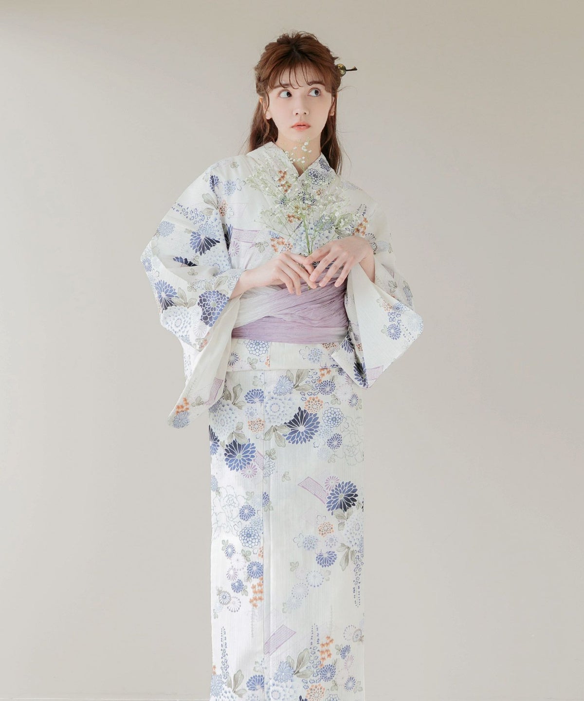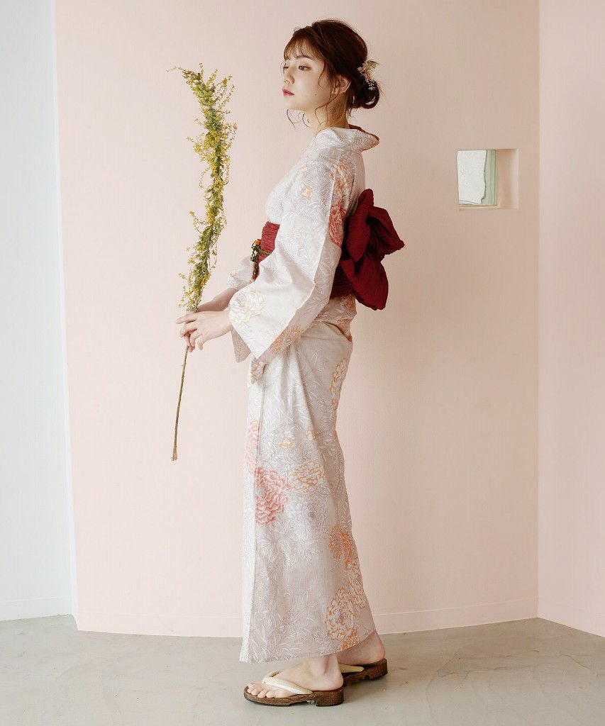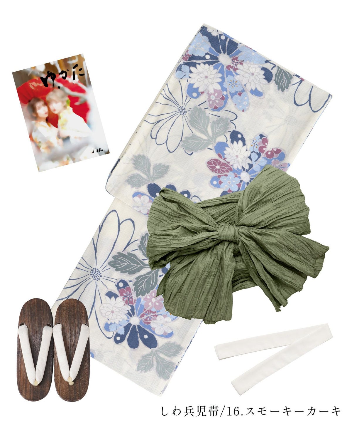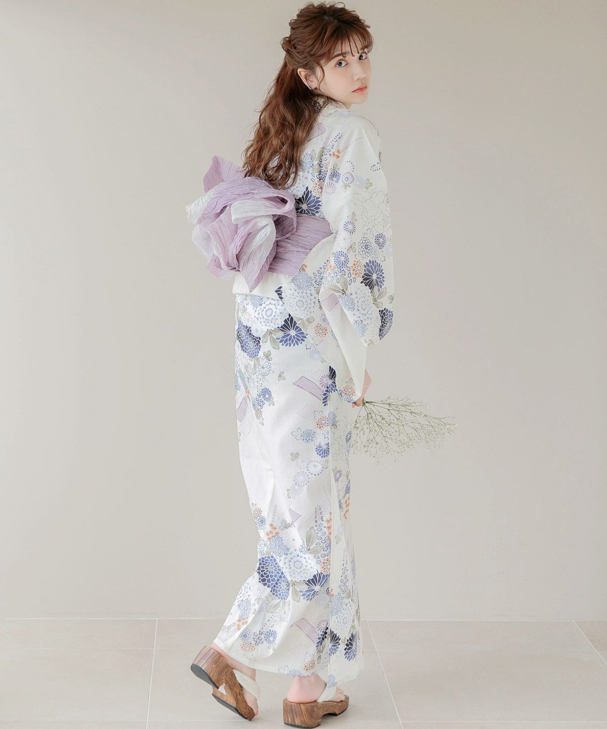 浴衣5点セット(ゆかた・帯・下駄・着付けマニュアル・腰ひも) 梅見月の菊ちらし