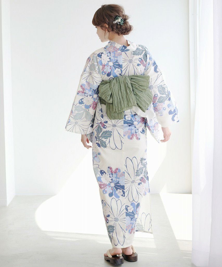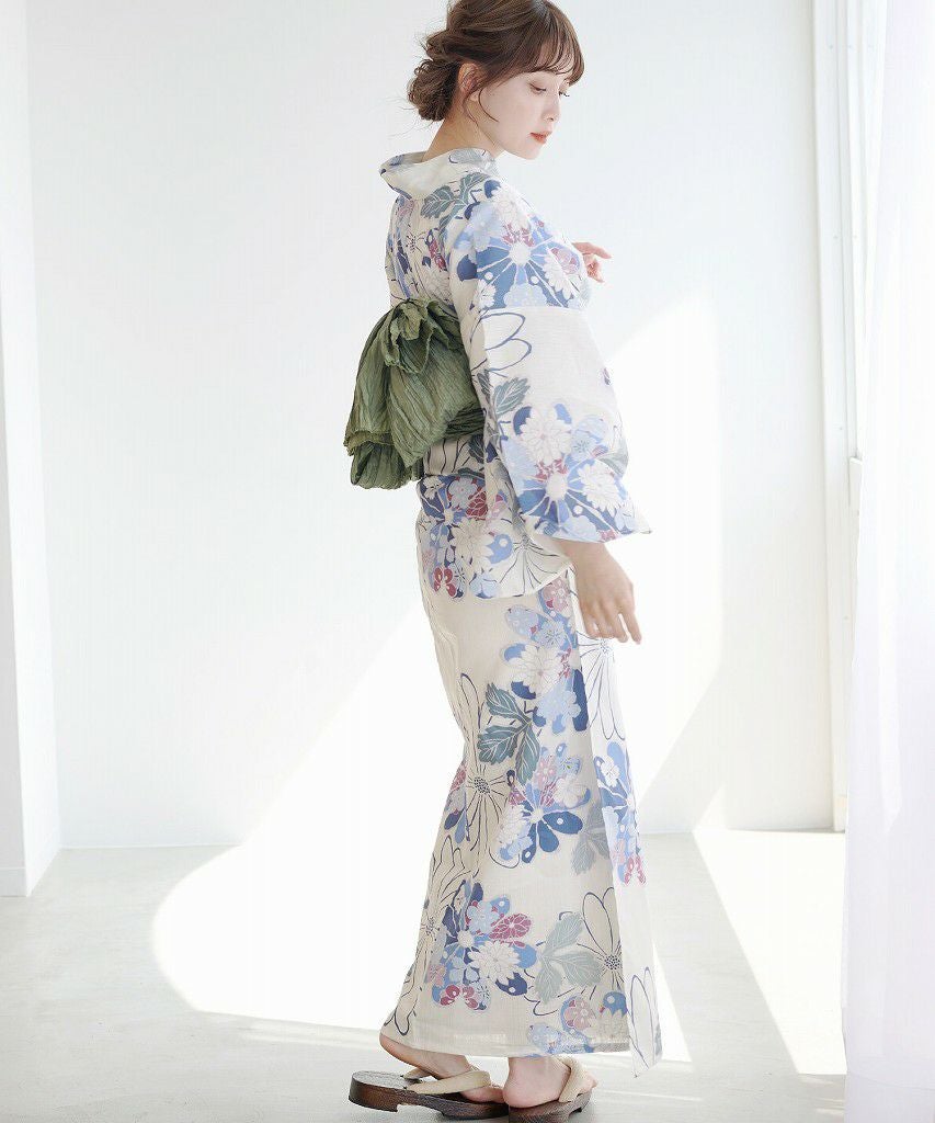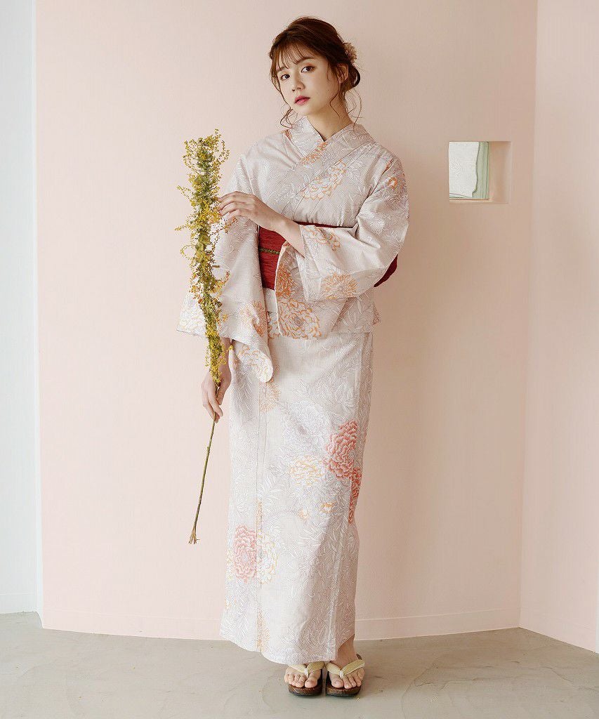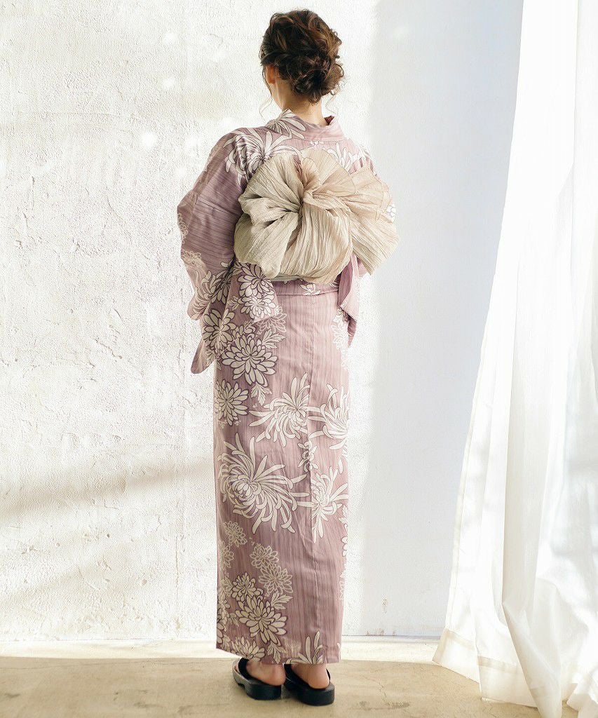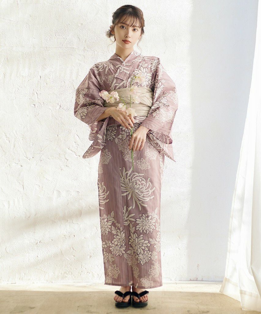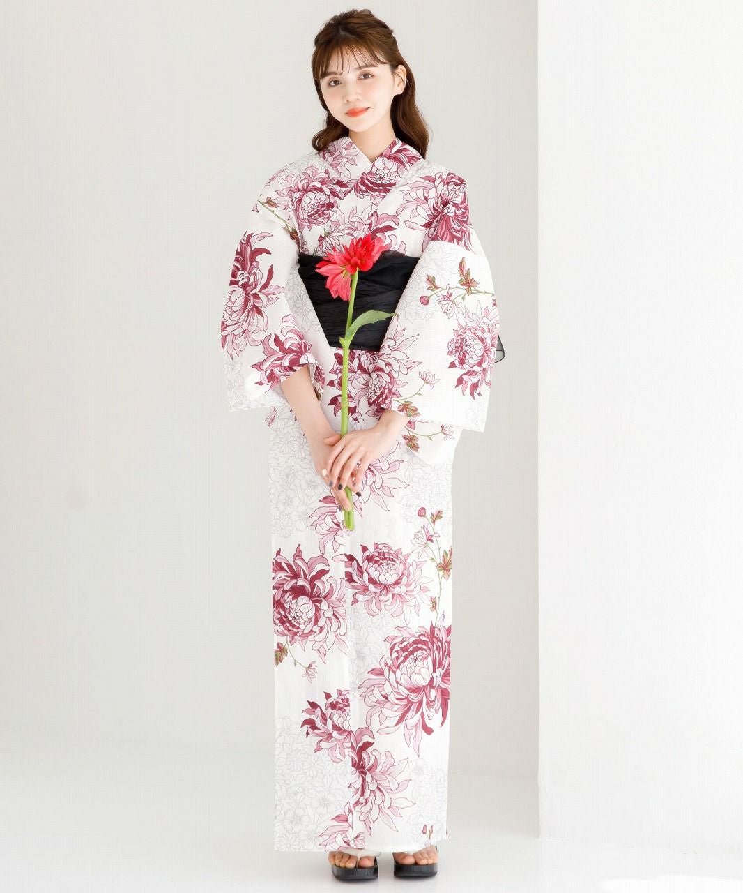 浴衣5点セット(ゆかた・帯・下駄・着付けマニュアル・腰ひも) 梅見月の菊ちらし