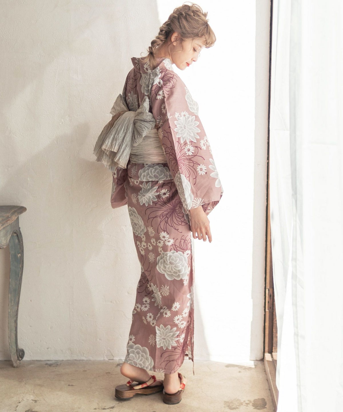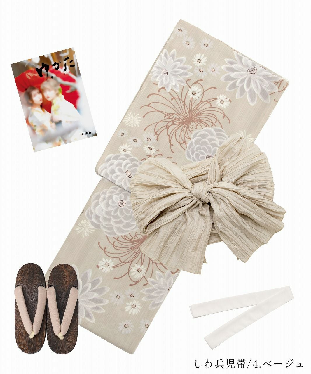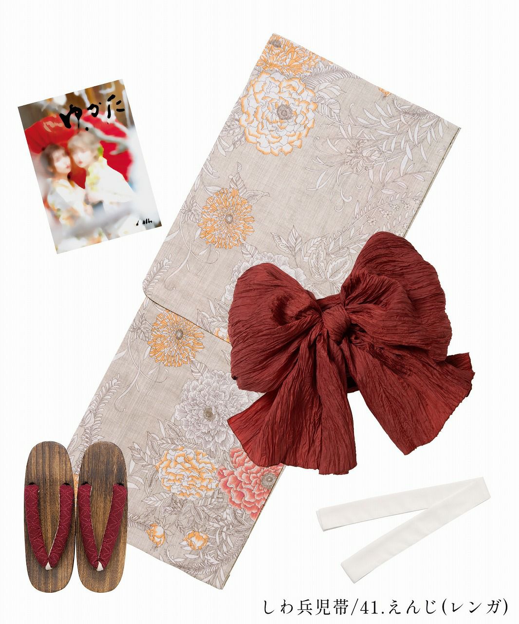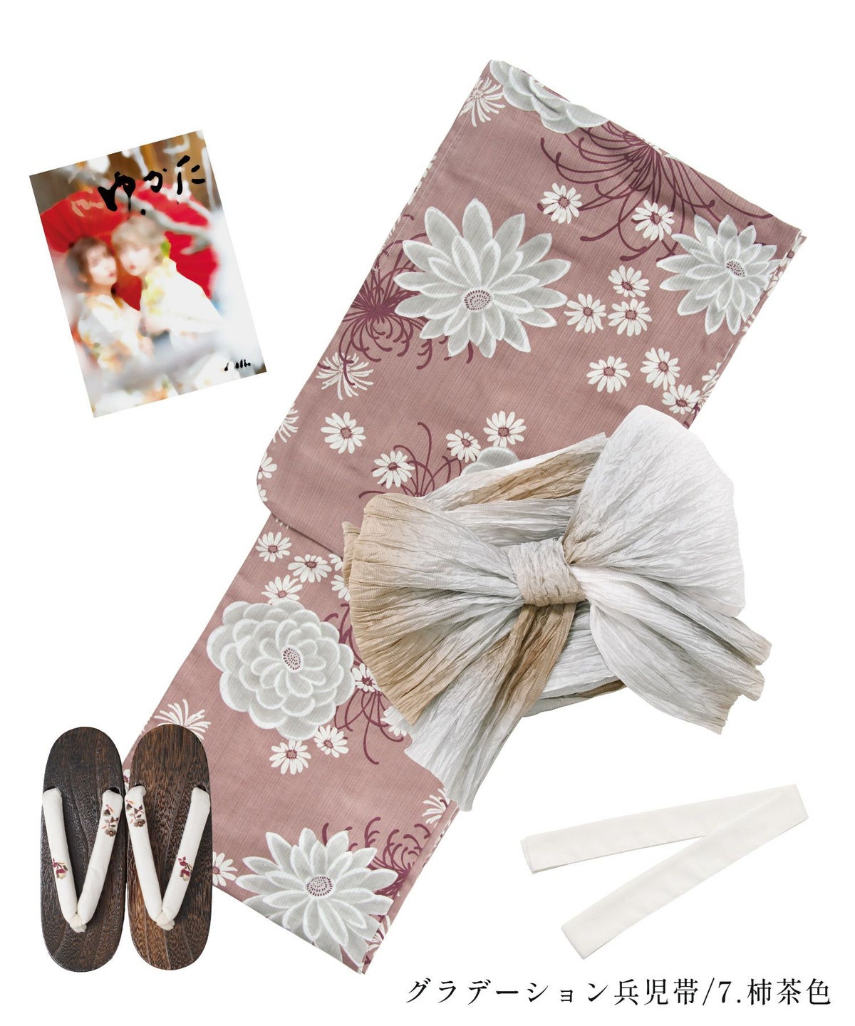 浴衣5点セット(ゆかた・帯・下駄・着付けマニュアル・腰ひも) 胡桃色の乱菊ながれ