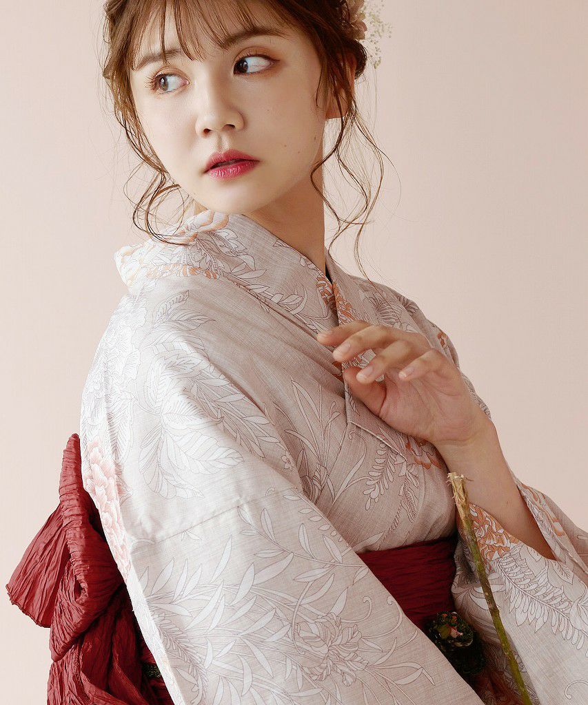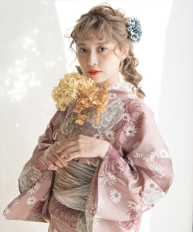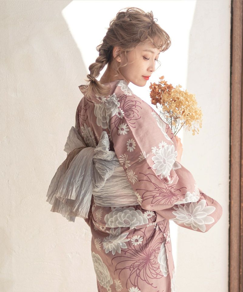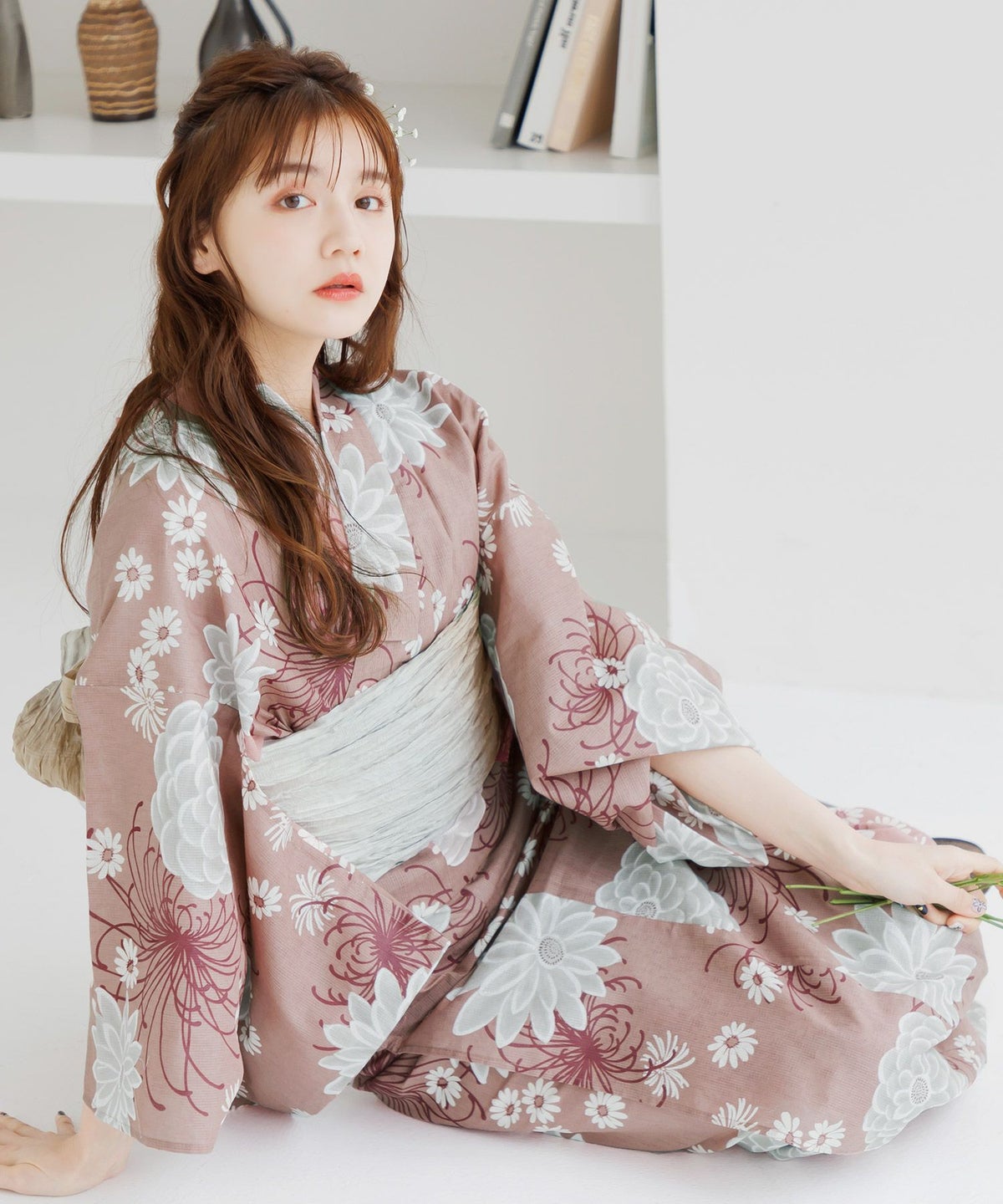 浴衣5点セット(ゆかた・帯・下駄・着付けマニュアル・腰ひも) 胡桃色の乱菊ながれ