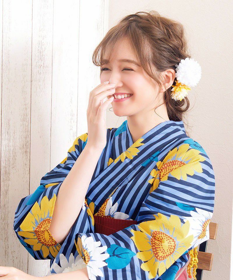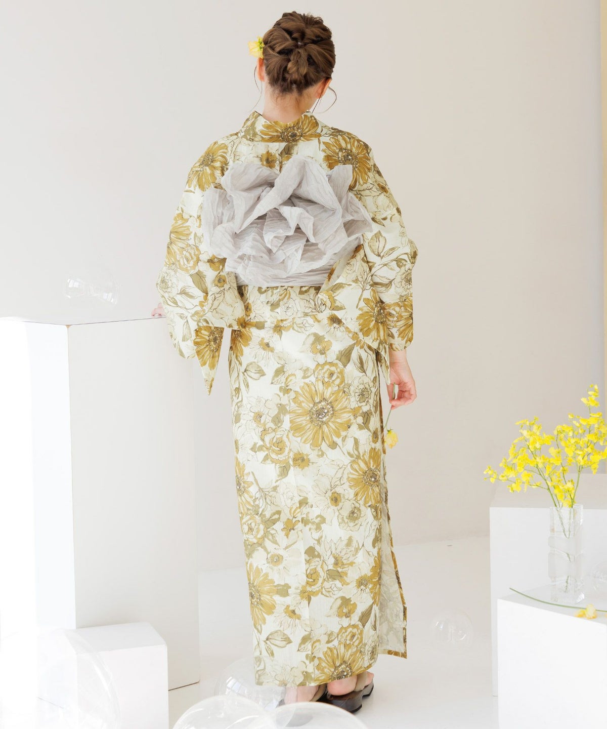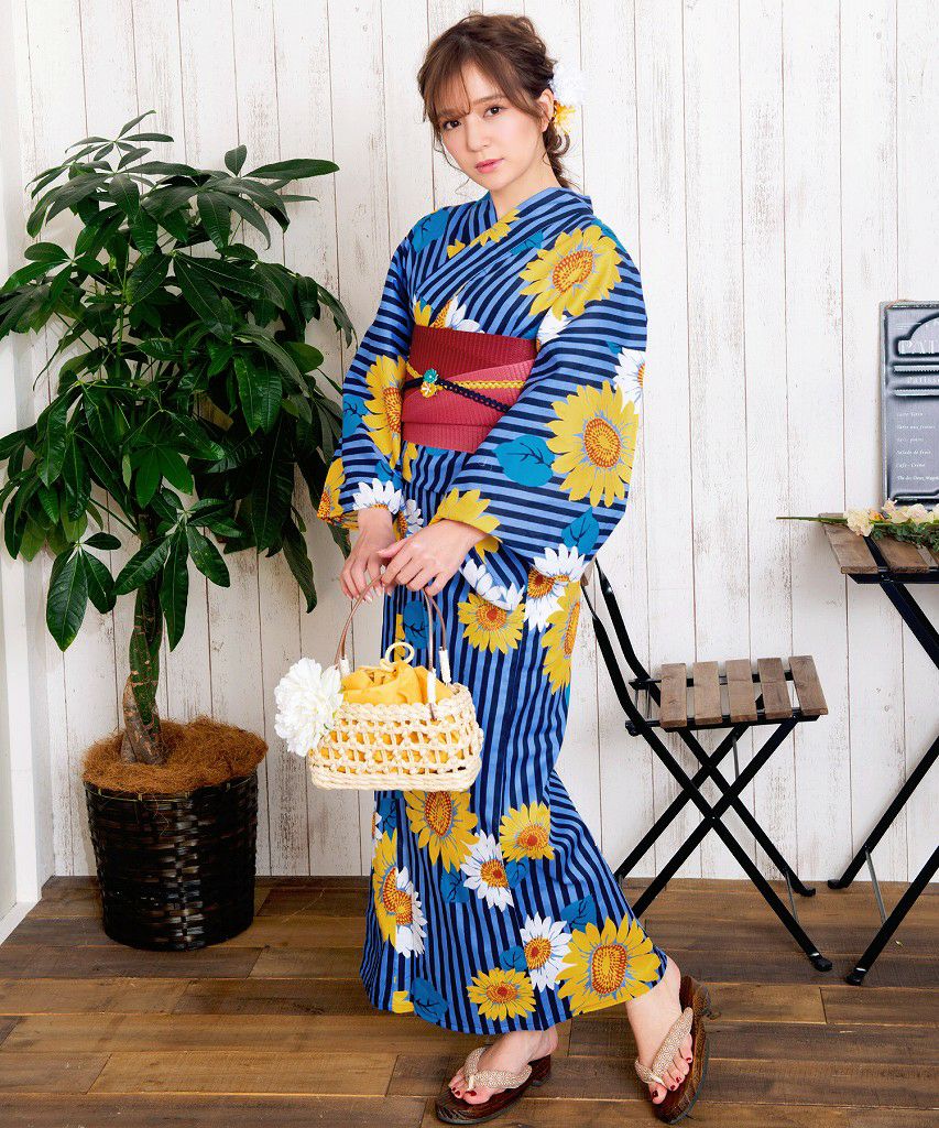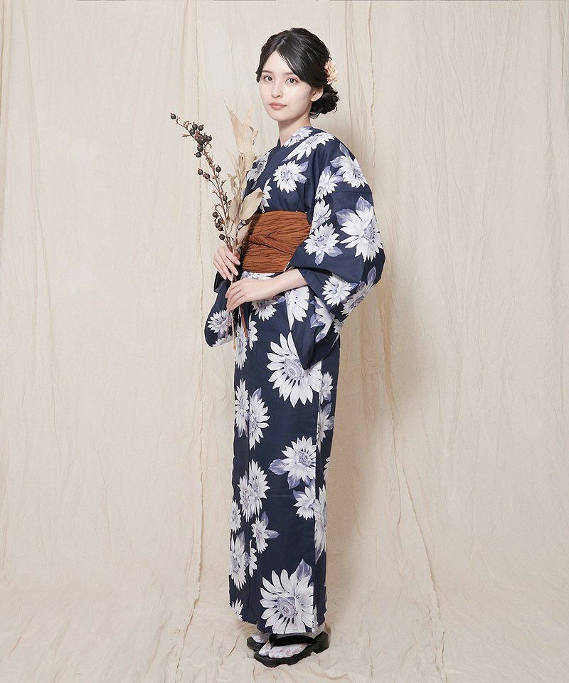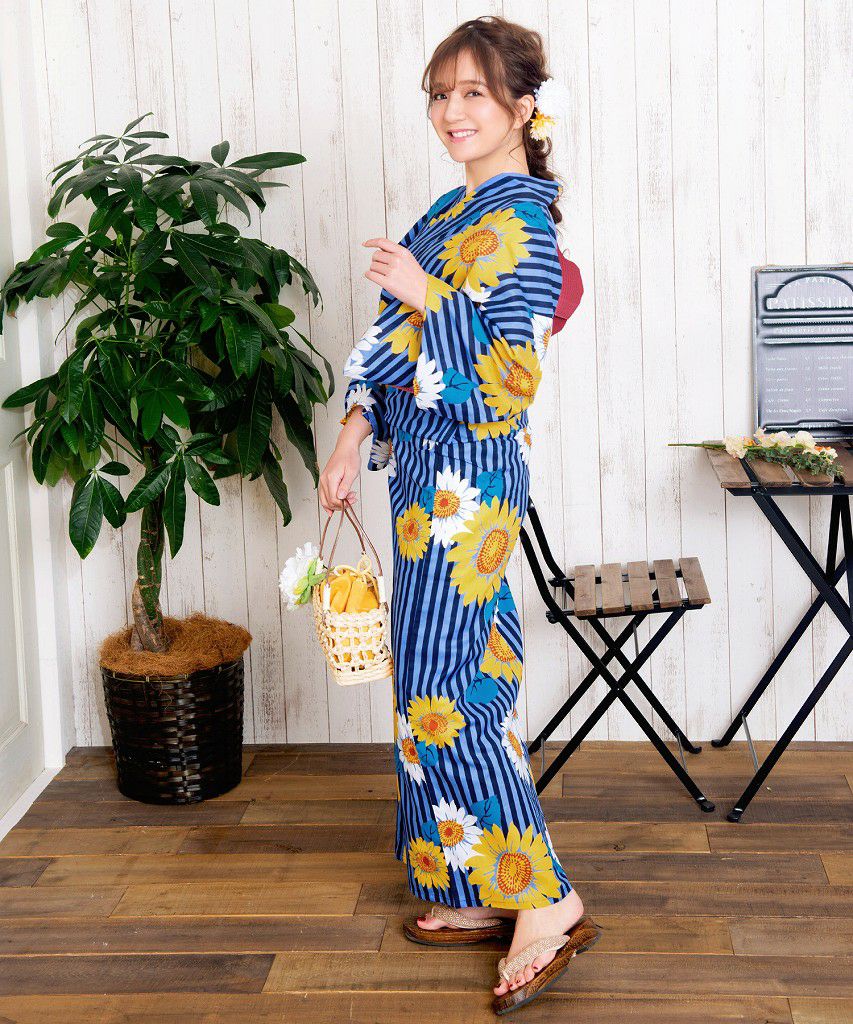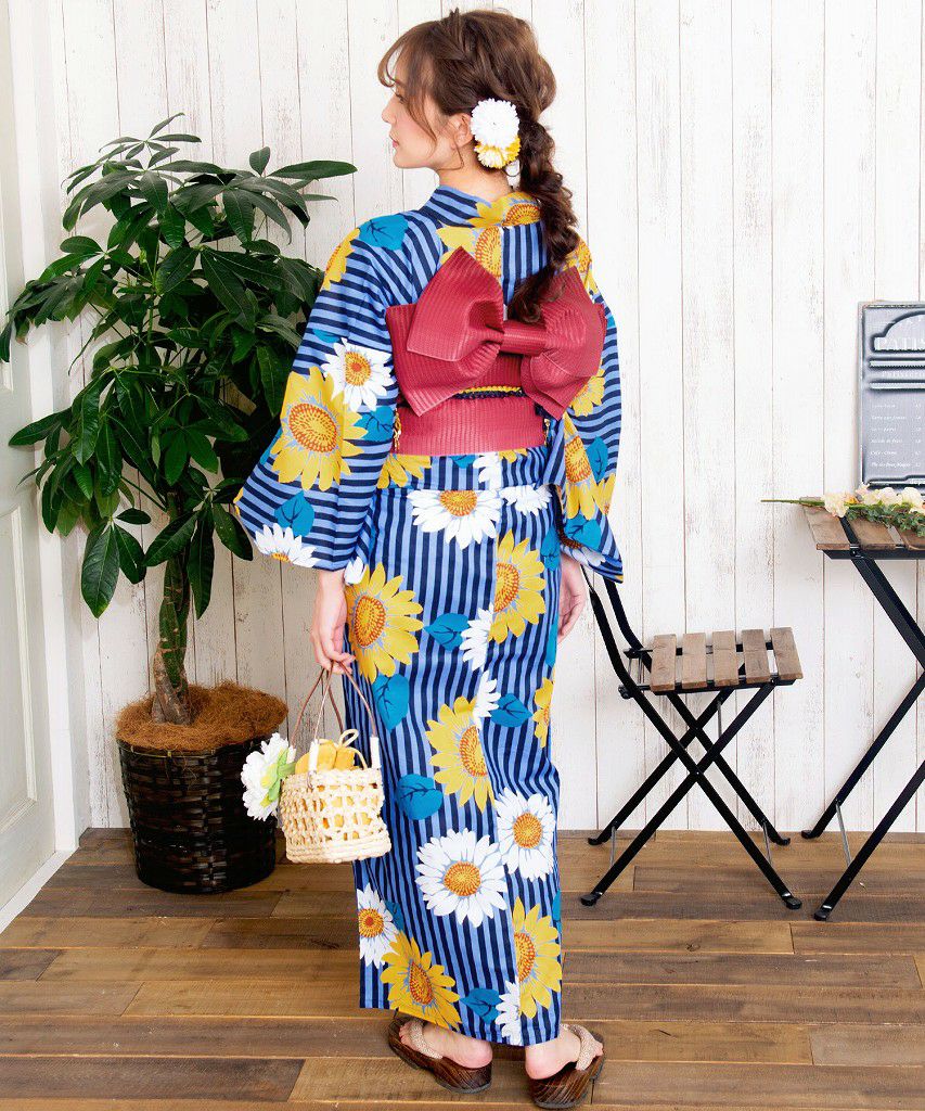 浴衣5点セット(ゆかた・帯・下駄・着付けマニュアル・腰ひも) 夏色向日葵しらべ