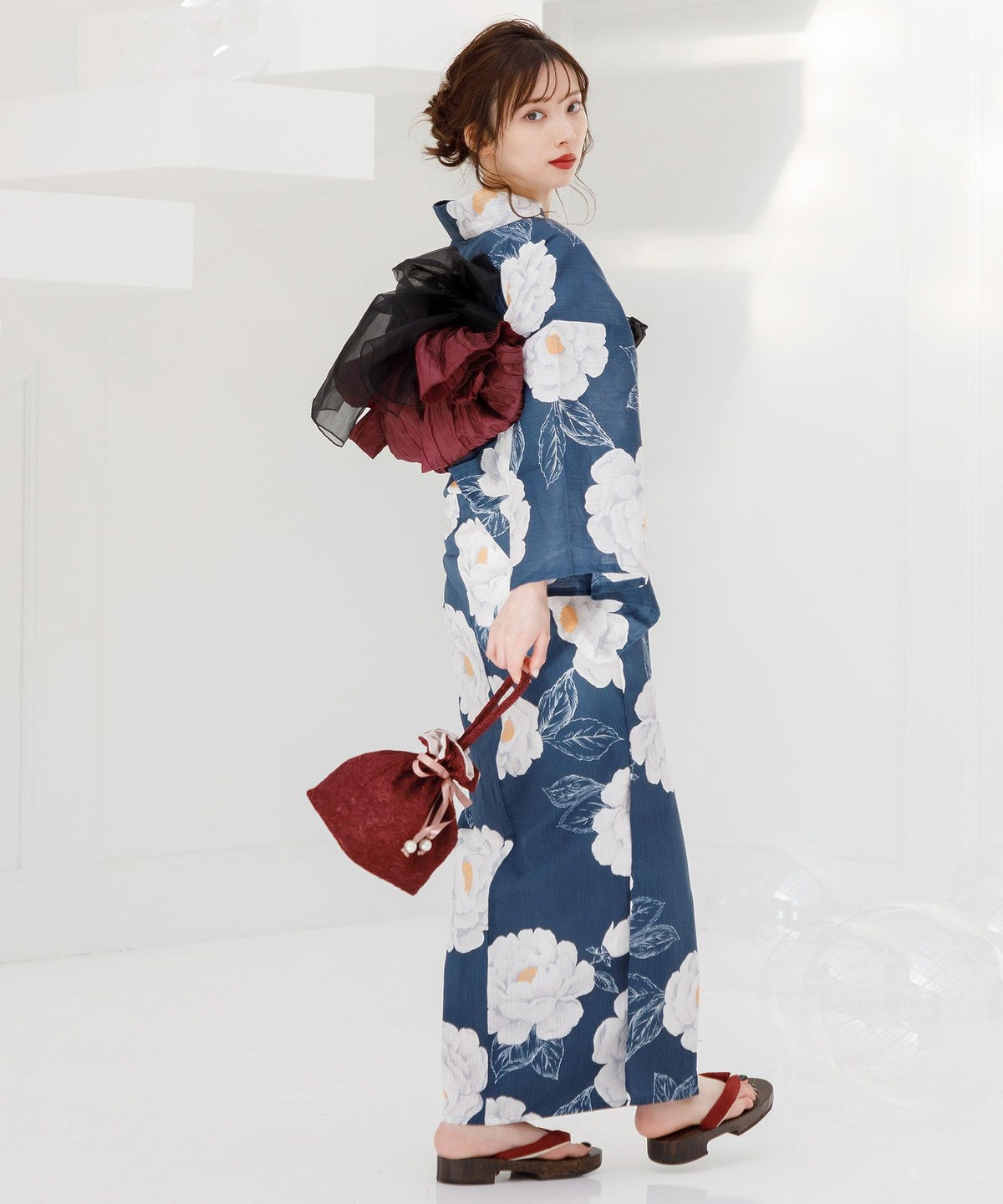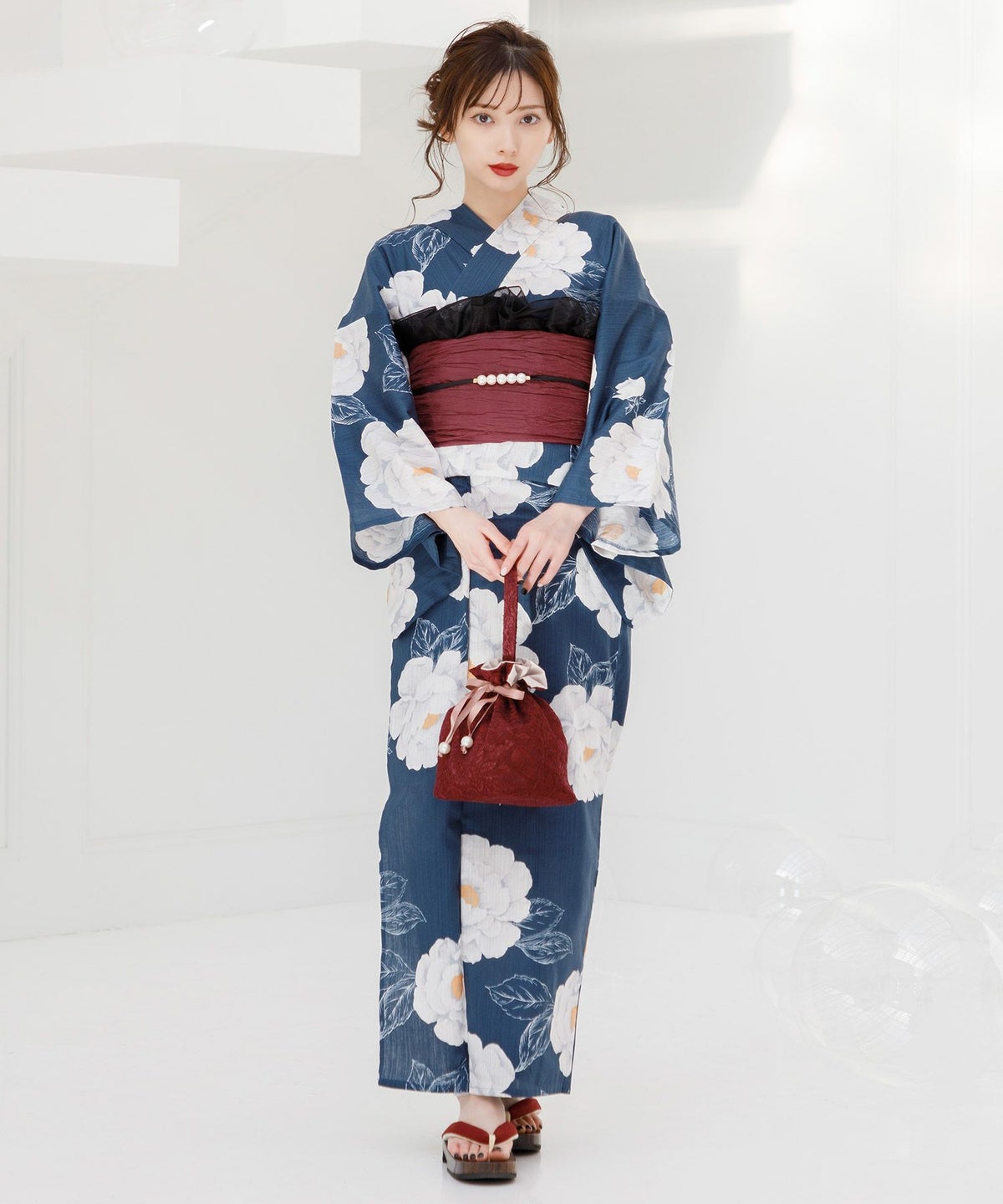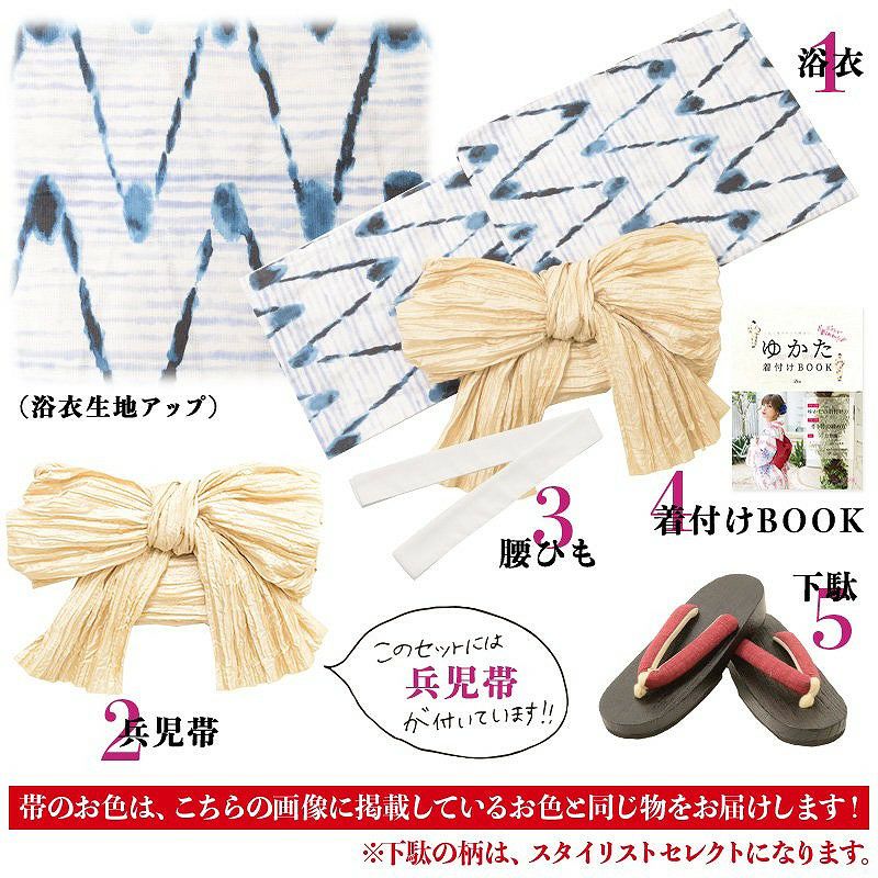 2026 浴衣5点セット(ゆかた・帯・下駄・着付けマニュアル・腰ひも) 涼風の藍紺牡丹