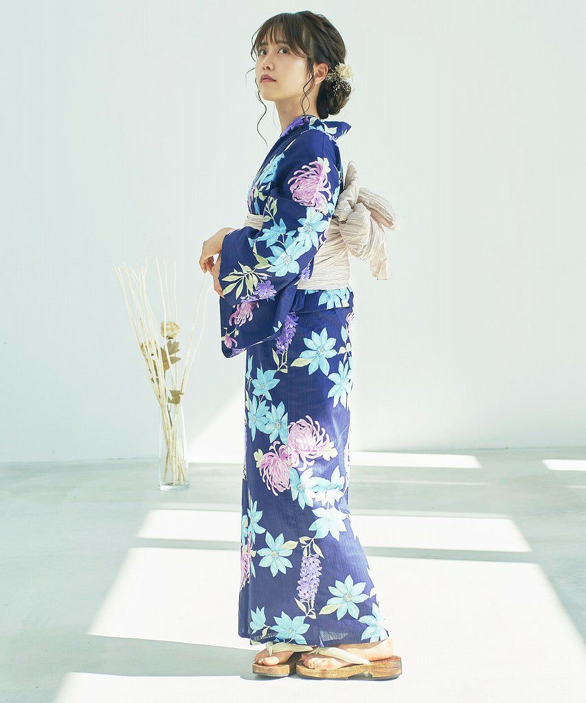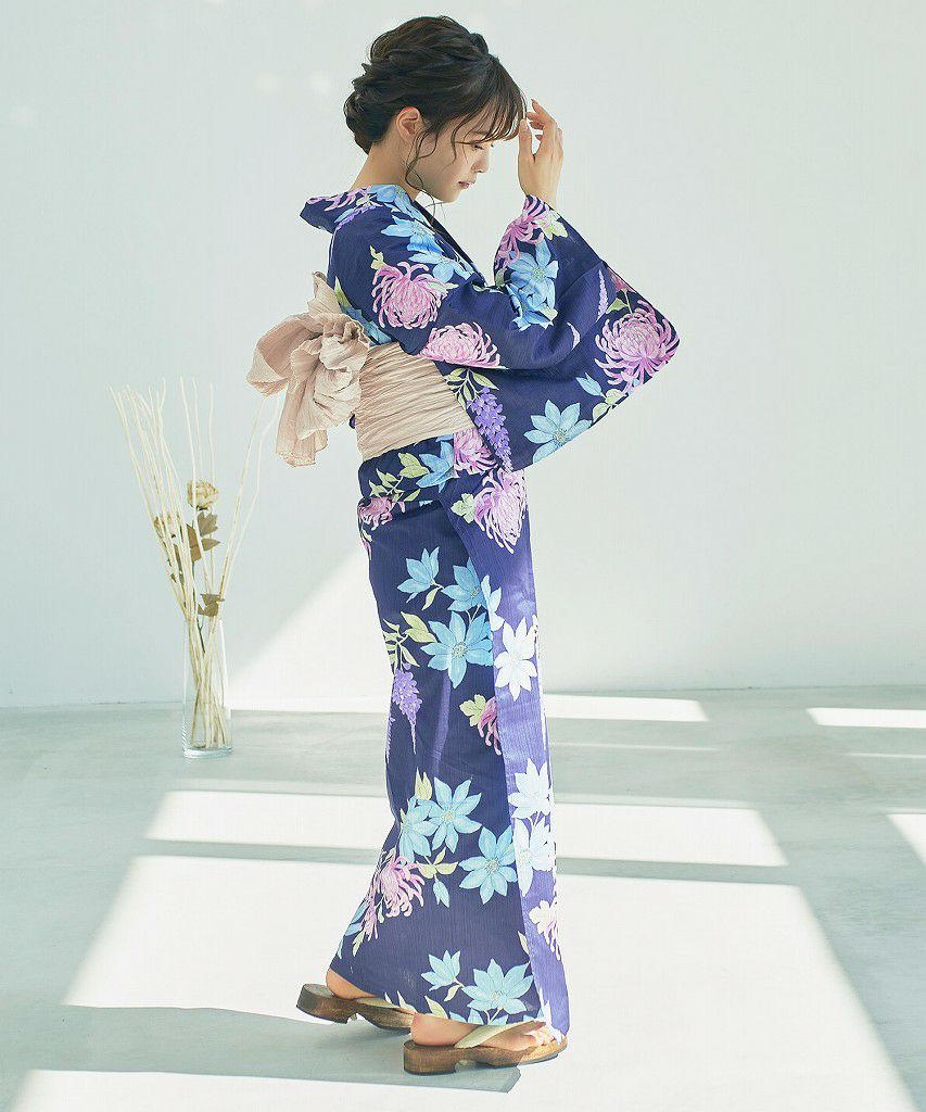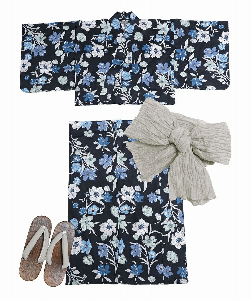 浴衣5点セット(ゆかた・帯・下駄・着付けマニュアル・腰ひも) 涼風の手毬菊