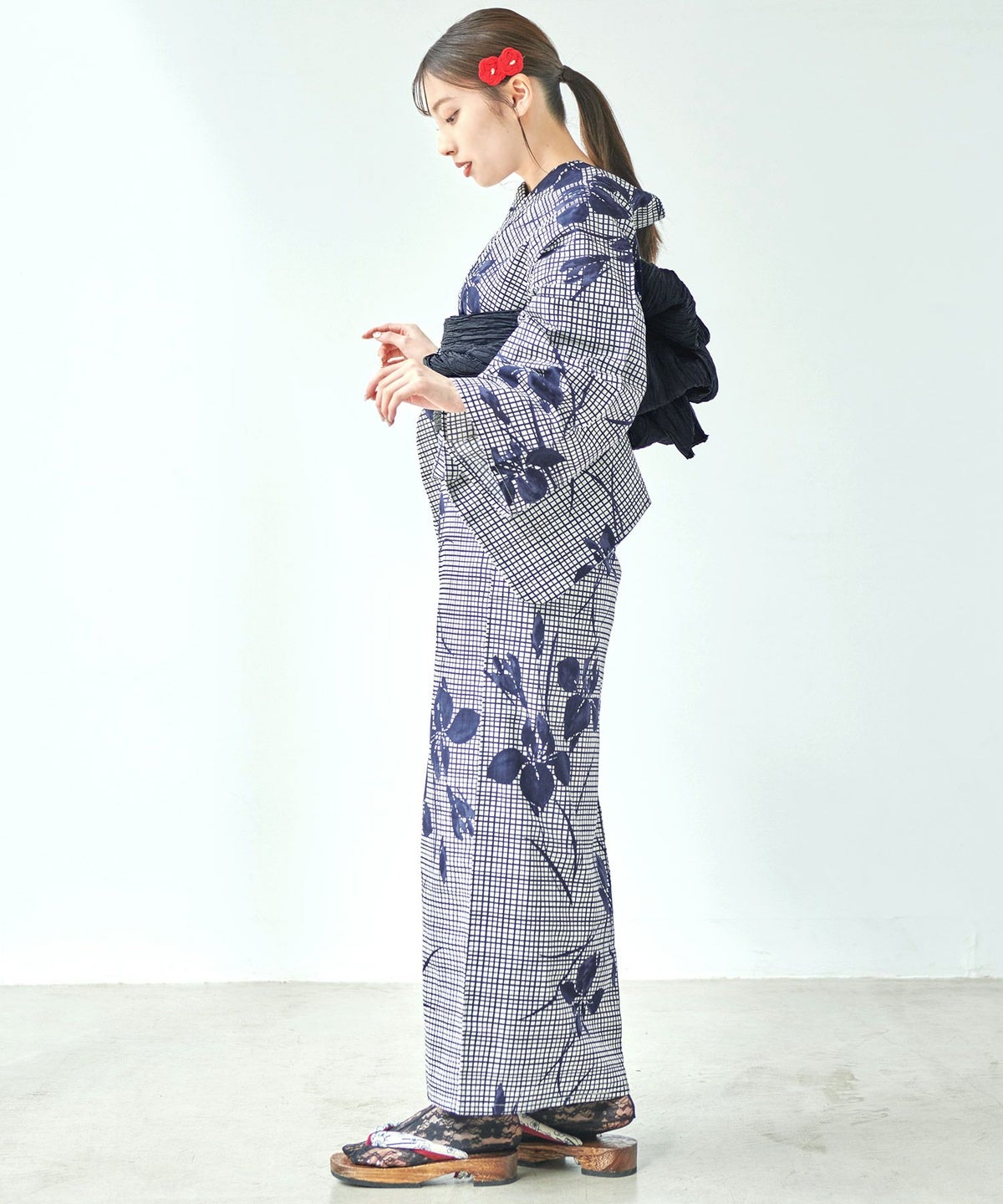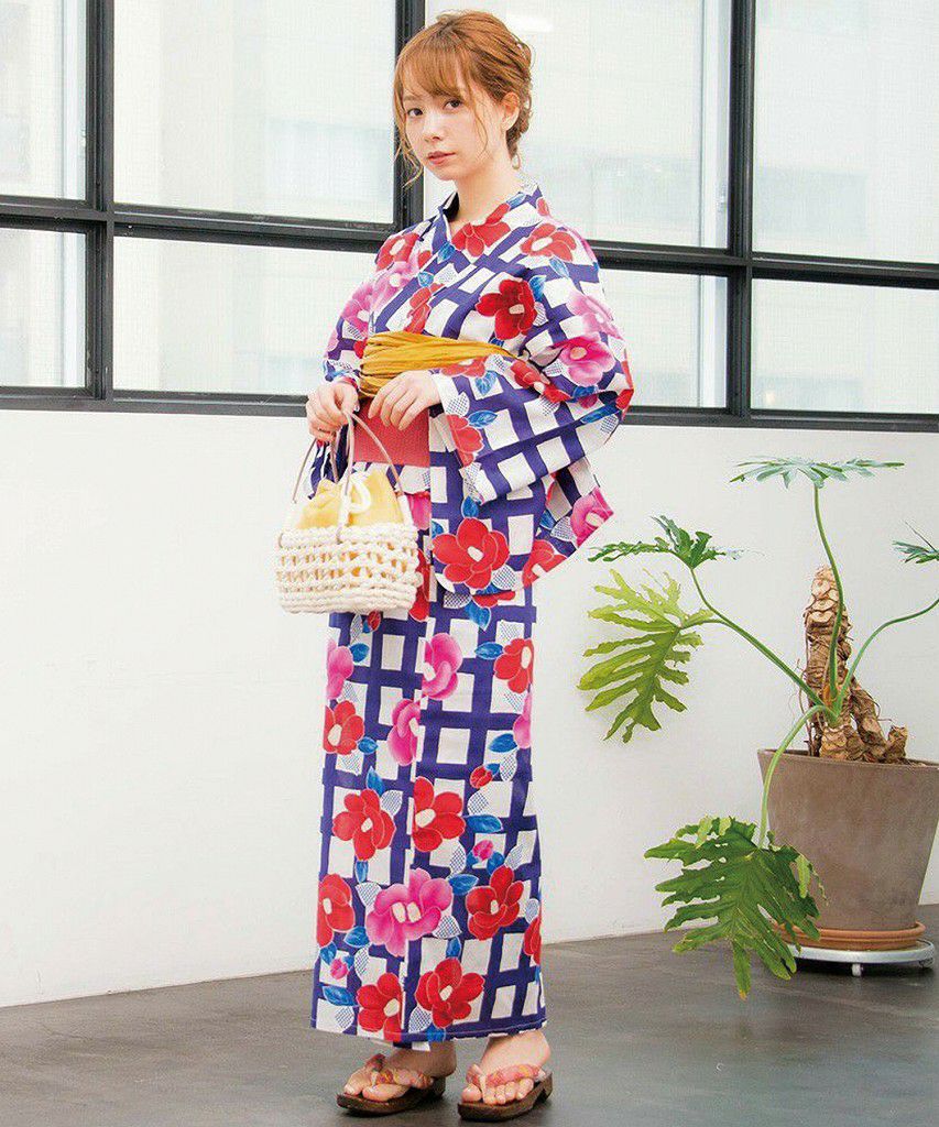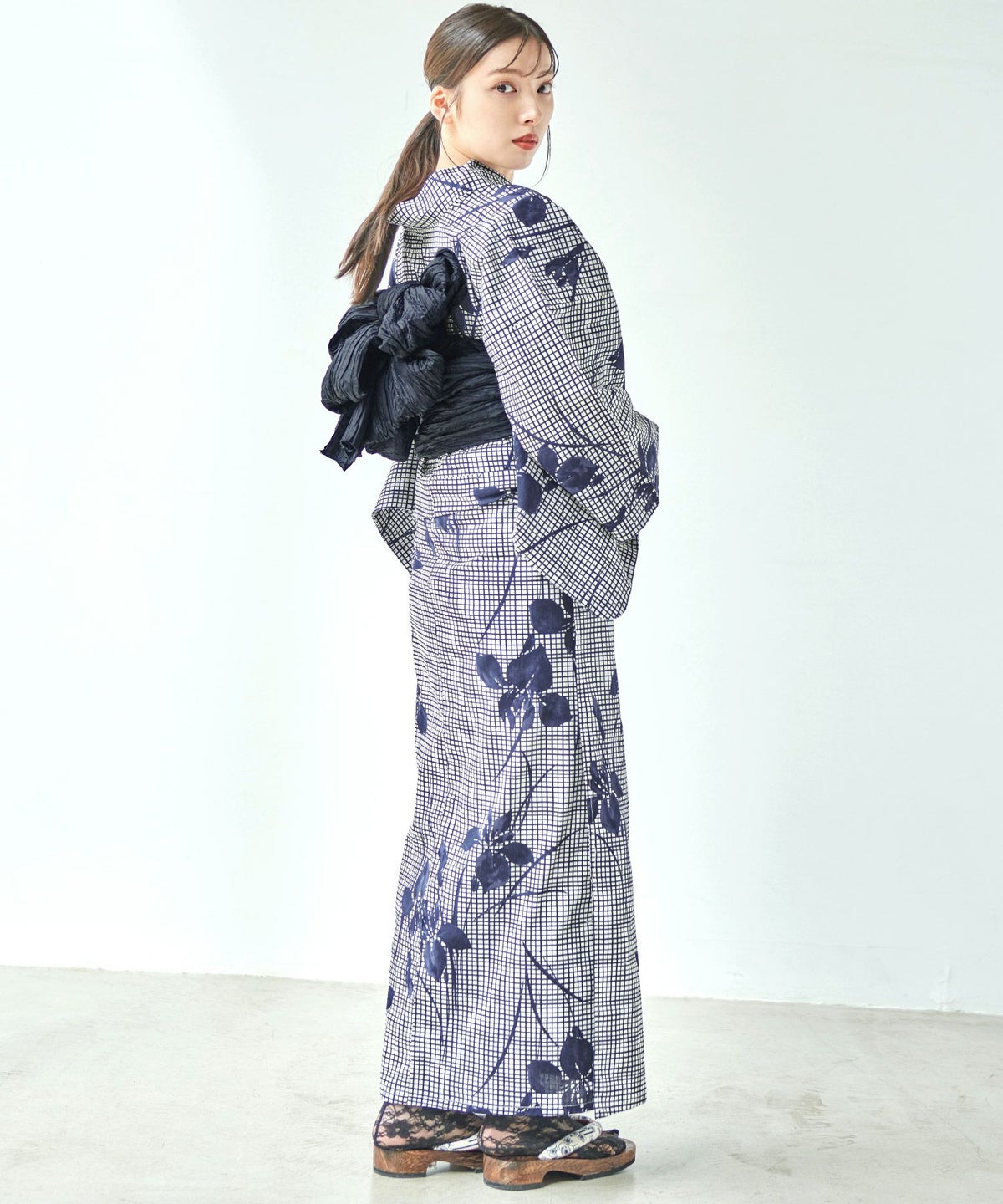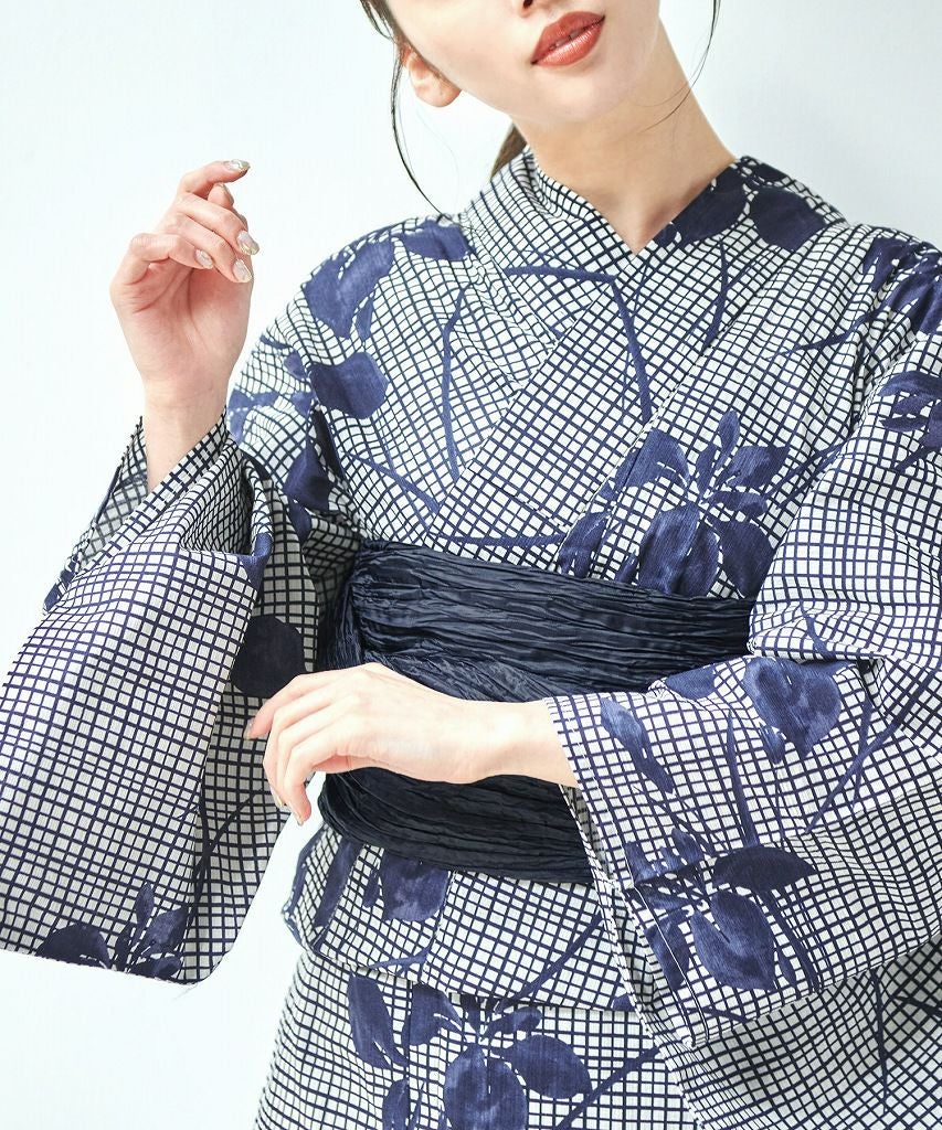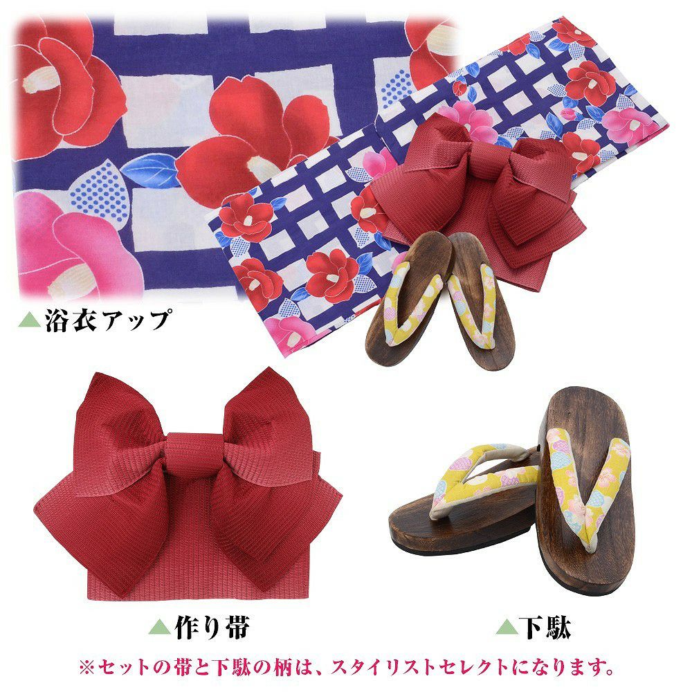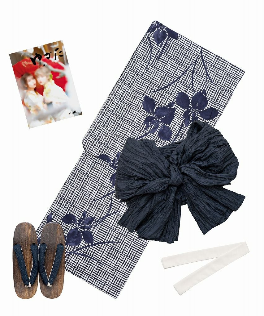 浴衣5点セット(ゆかた・帯・下駄・カタログ・腰ひも) 藍色格子とレトロ牡丹
