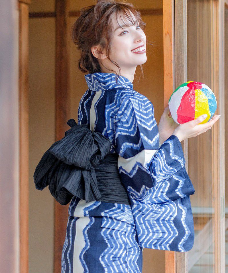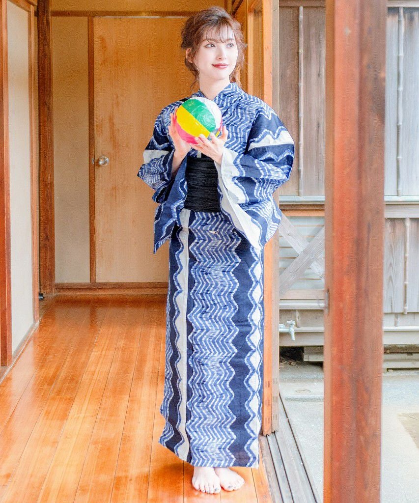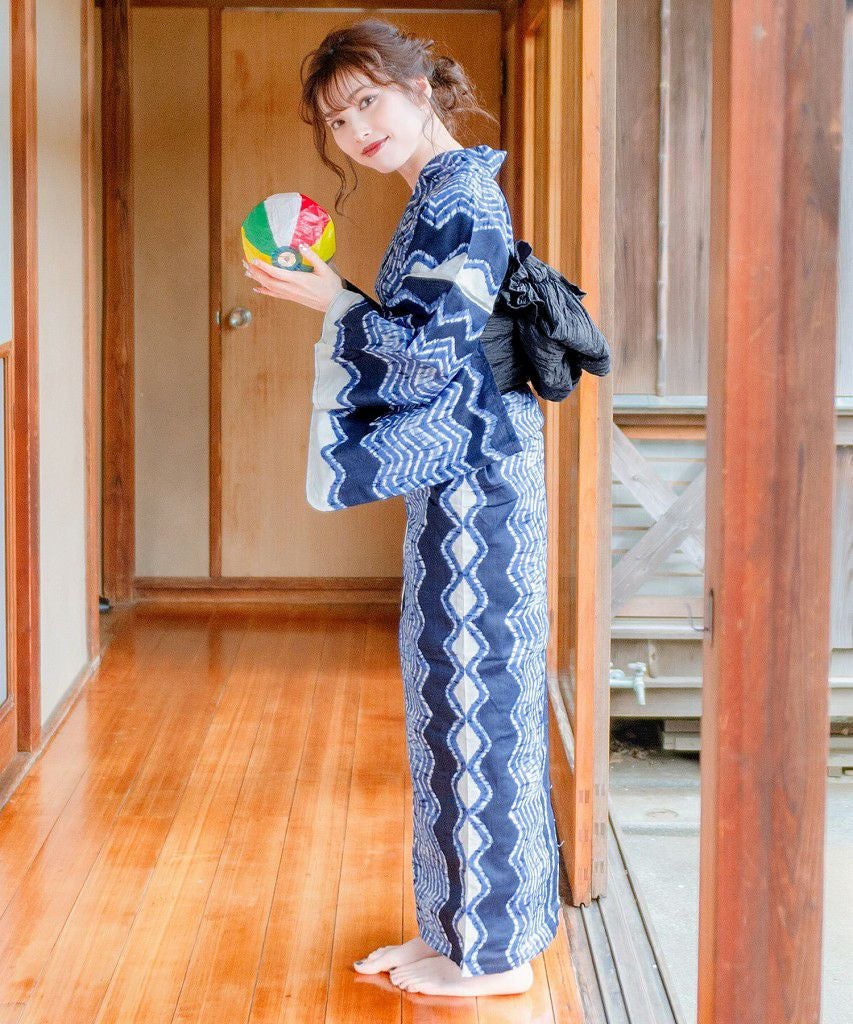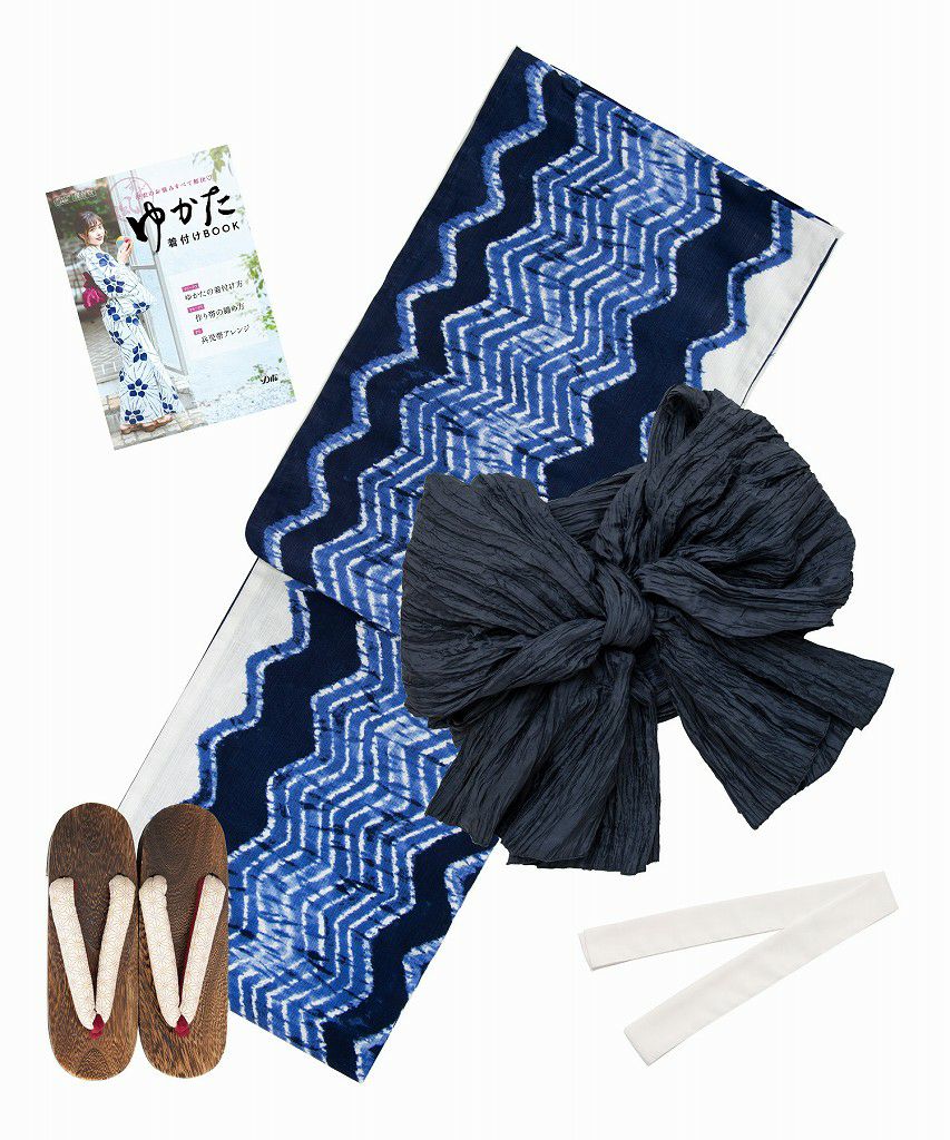 浴衣5点セット(ゆかた・帯・下駄・着付けマニュアル・腰ひも) 和調の矢絣ならべ