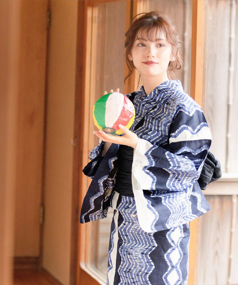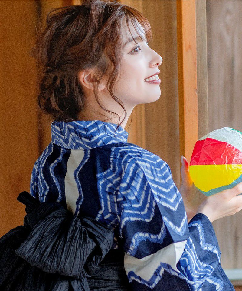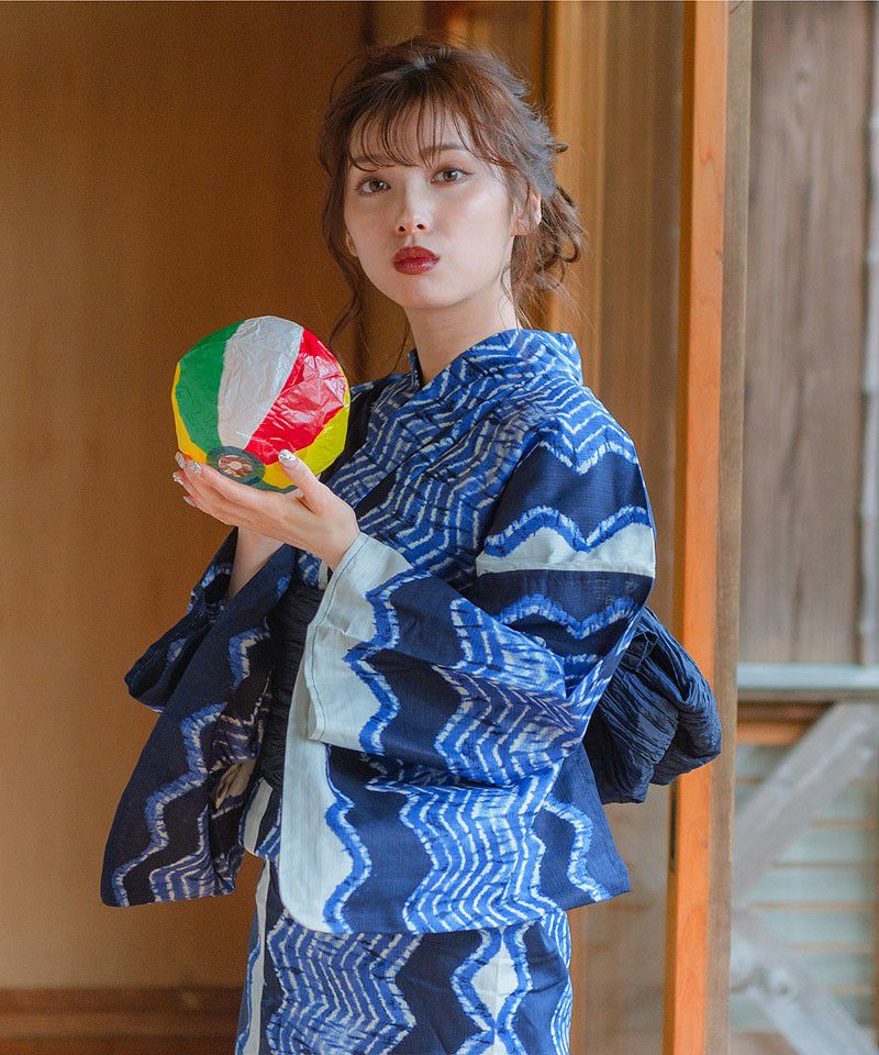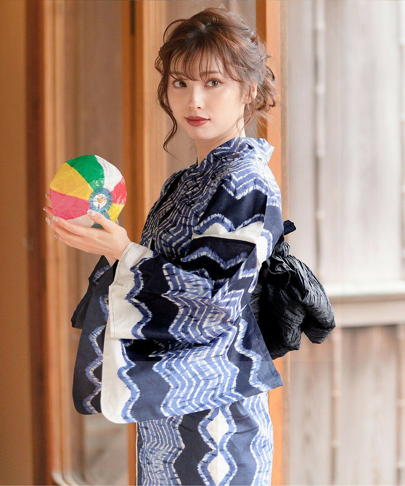浴衣5点セット(ゆかた・帯・下駄・着付けマニュアル・腰ひも) 和調の矢絣ならべ