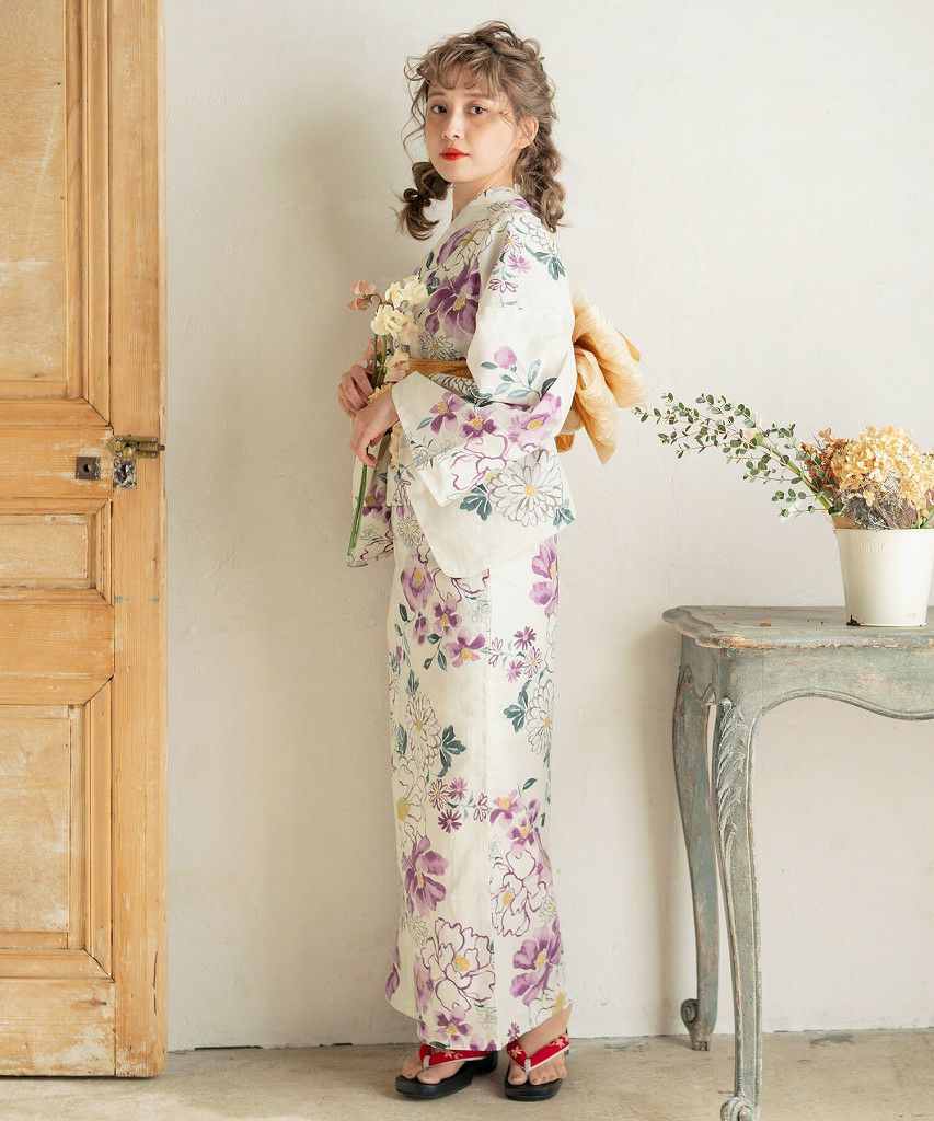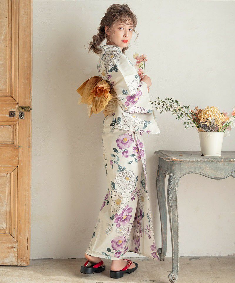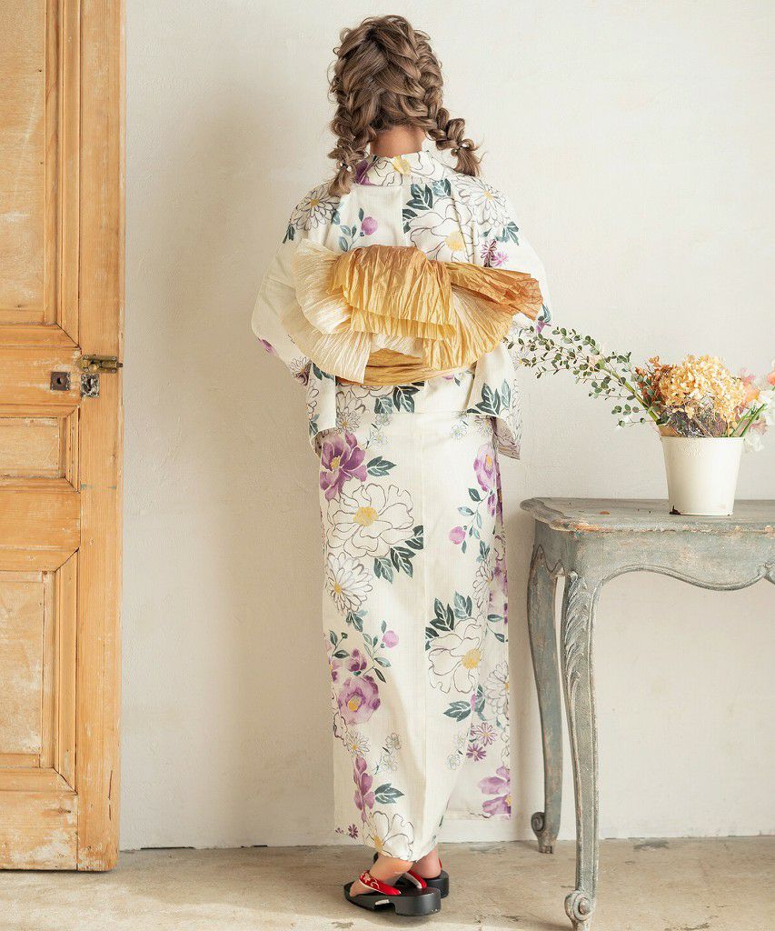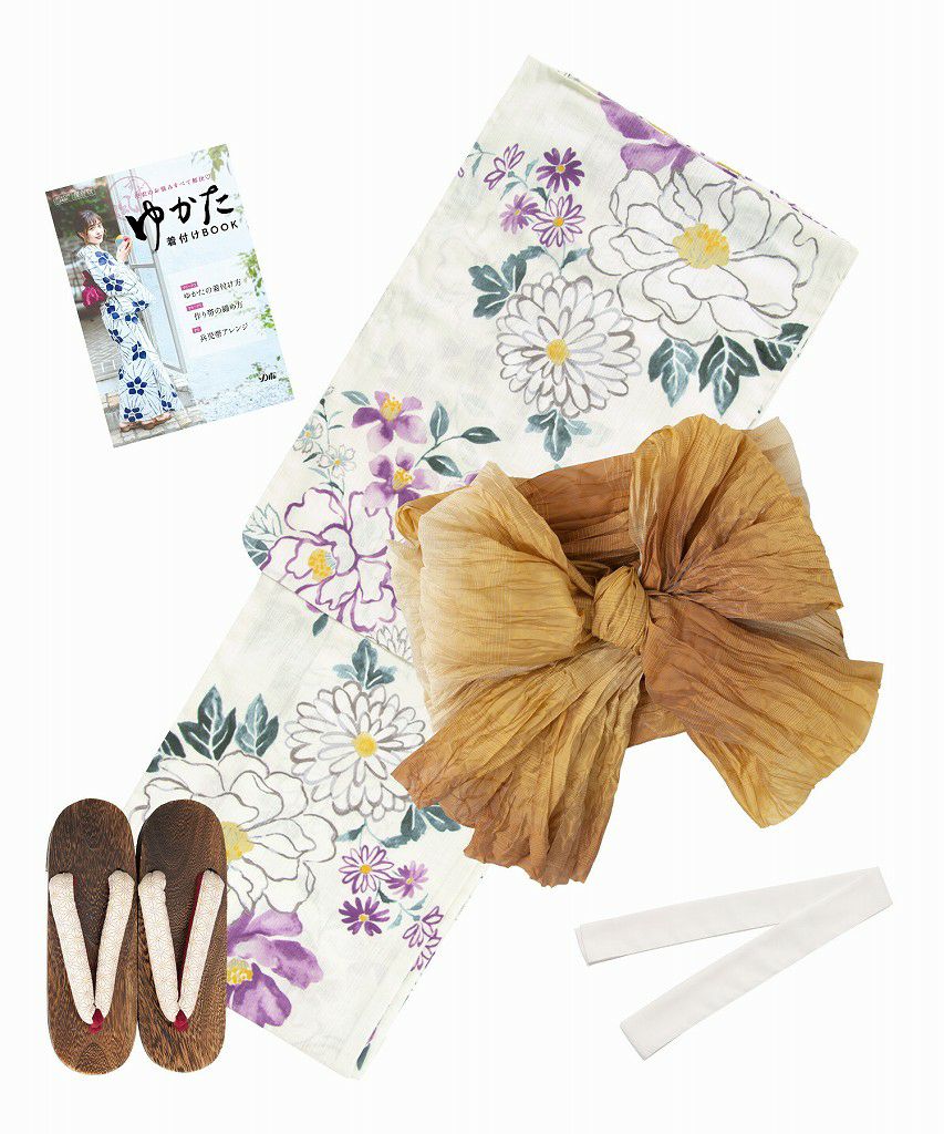 浴衣5点セット(ゆかた・帯・下駄・着付けマニュアル・腰ひも) アンティークフラワー
