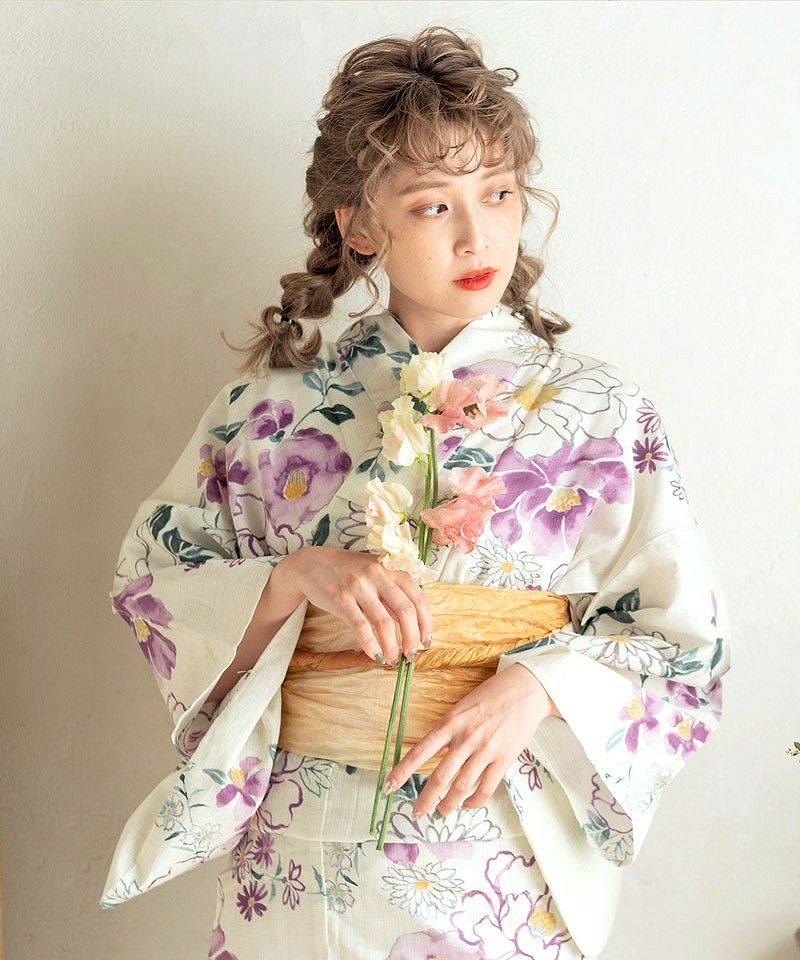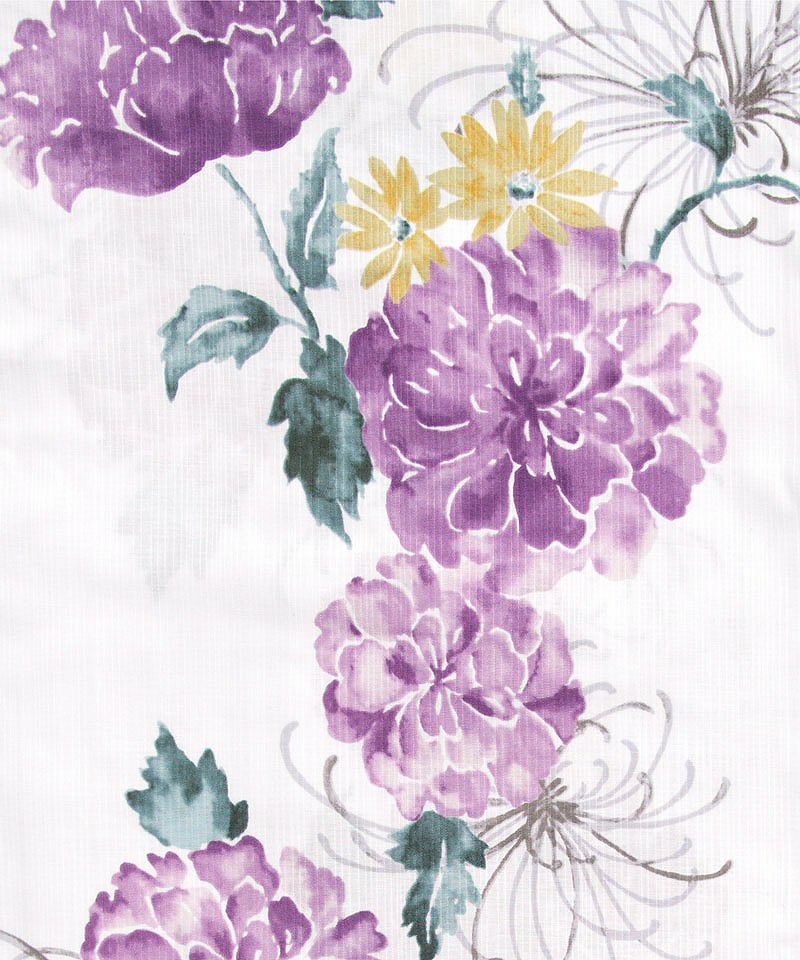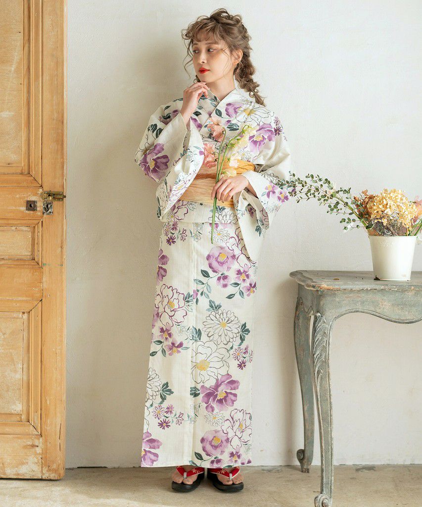 浴衣5点セット(ゆかた・帯・下駄・着付けマニュアル・腰ひも) 梅紫の麻しらべ