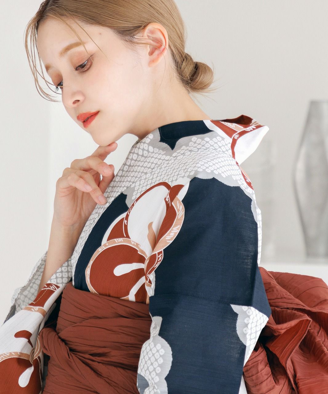 はんなり水彩椿(朱) 2025 浴衣5点セット(ゆかた・帯・下駄・着付けマニュアル・腰ひも)