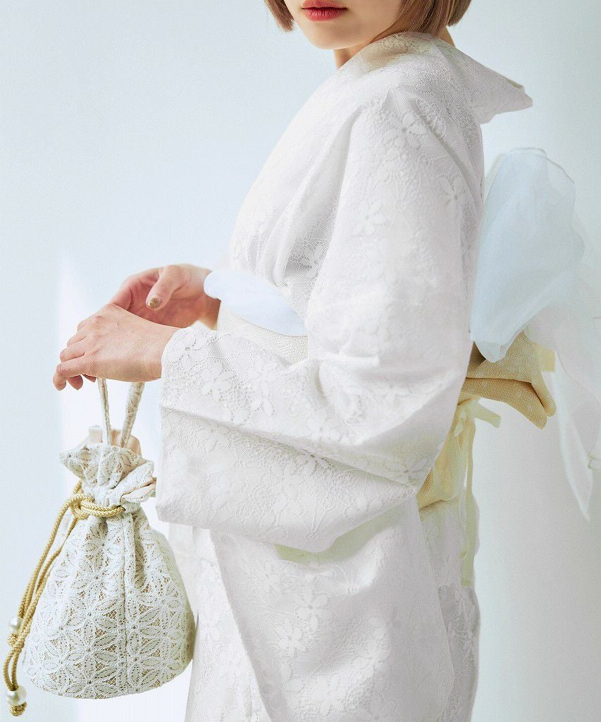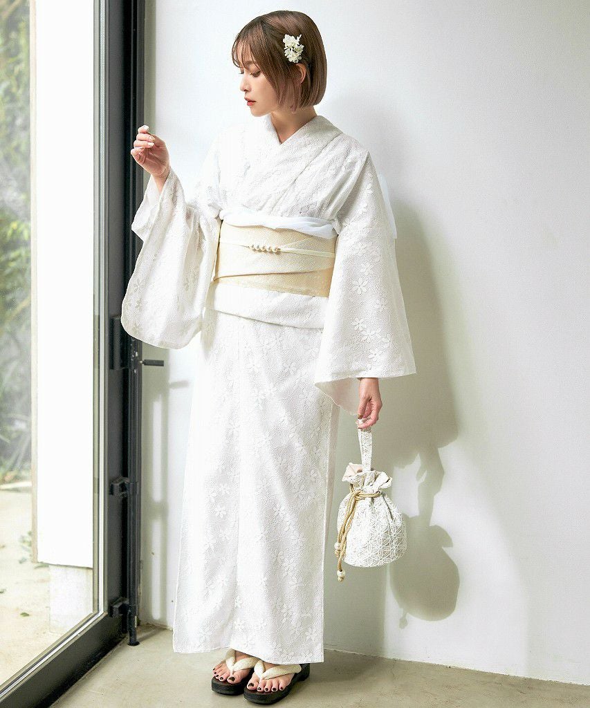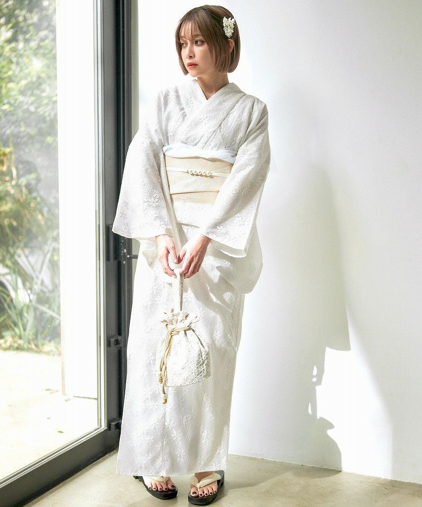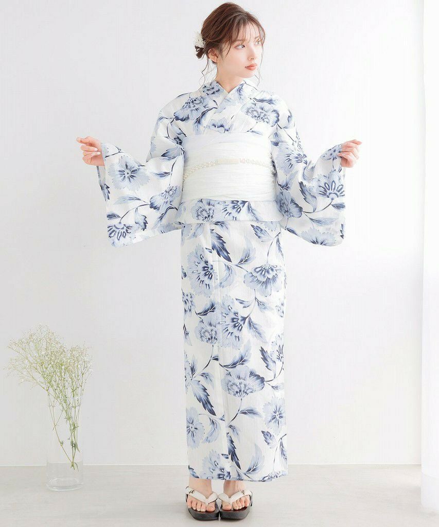 浴衣5点セット(ゆかた・帯・下駄・着付けマニュアル・腰ひも) 清楚な乙女白牡丹