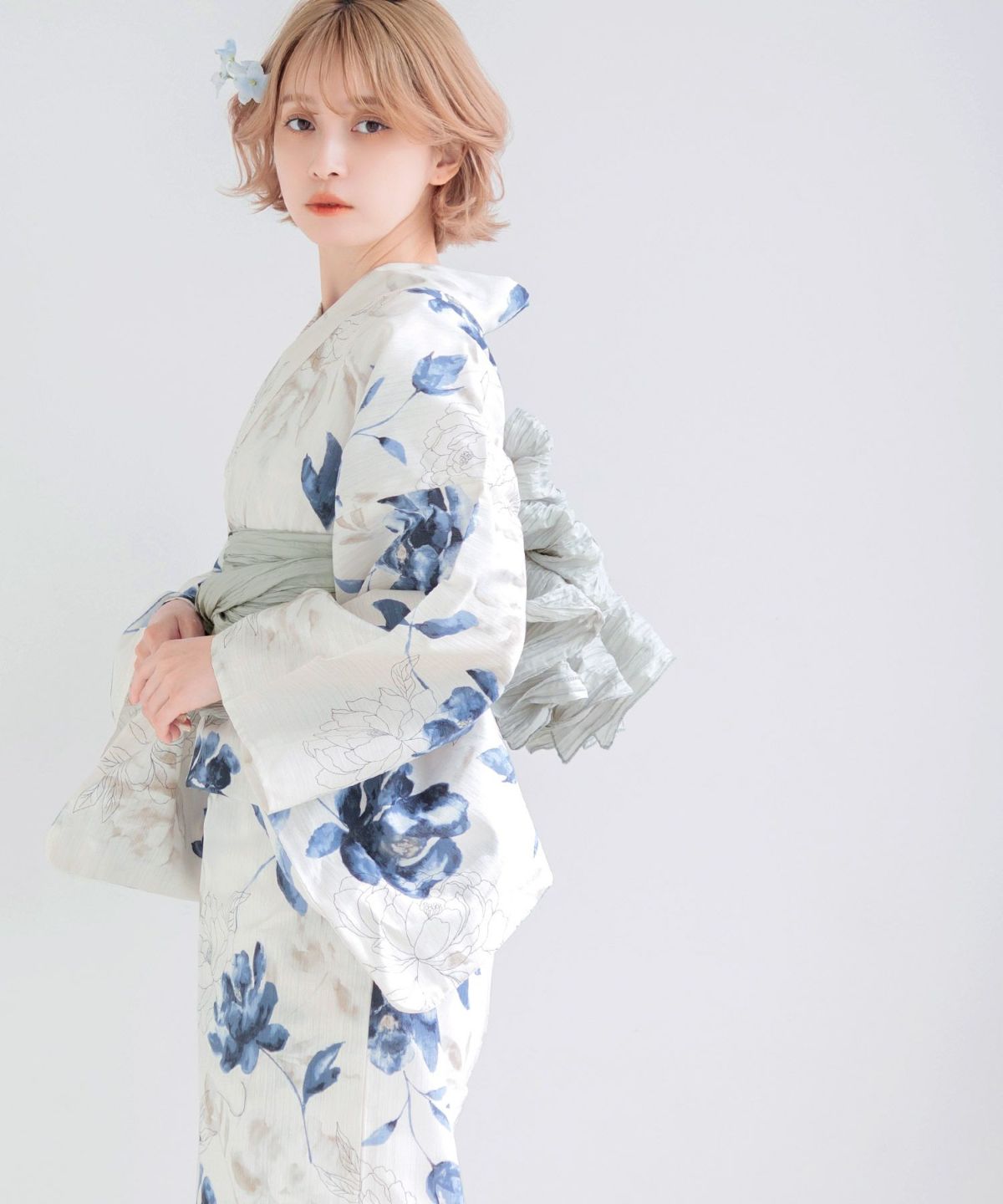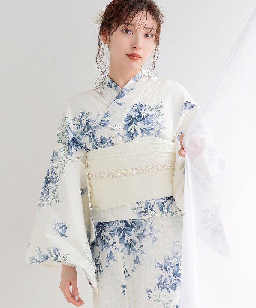 生成り色地に紫陽花 2025 浴衣5点セット(ゆかた・帯・下駄・着付けマニュアル・腰ひも)