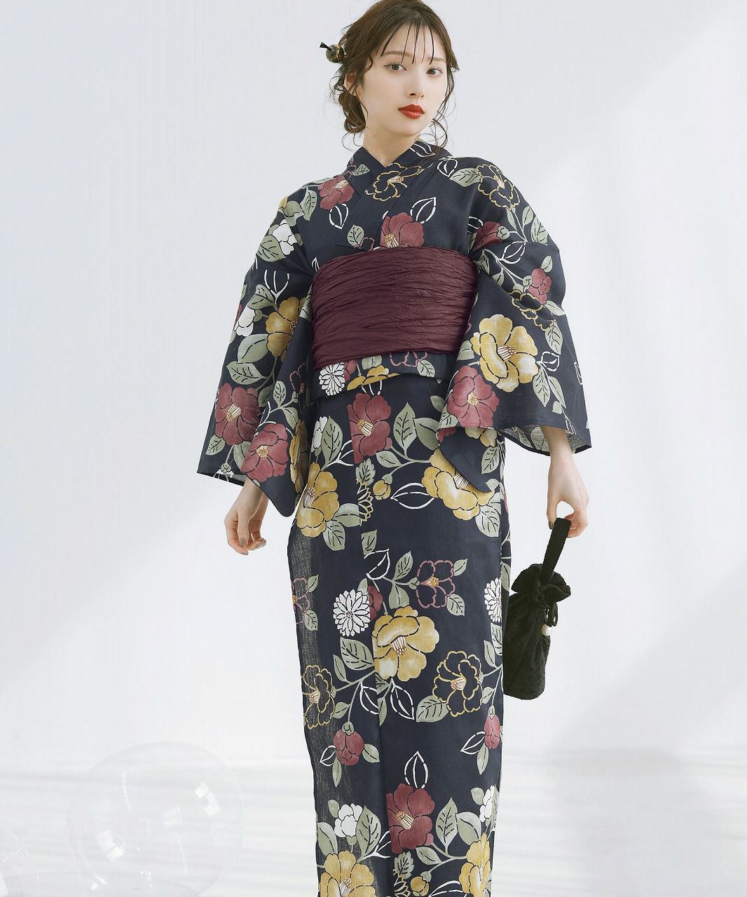 如月の椿(墨色) 2025 浴衣5点セット(ゆかた・帯・下駄・着付けマニュアル・腰ひも)