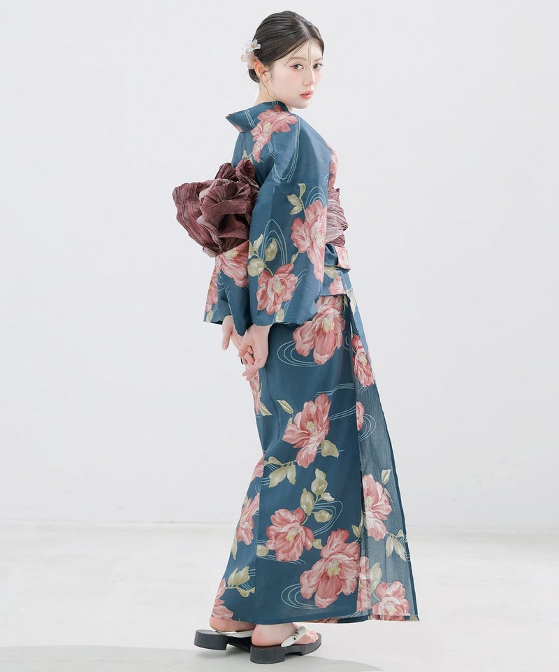 2026 浴衣5点セット(ゆかた・帯・下駄・着付けマニュアル・腰ひも) 【先行予約/6月上旬より順次発送予定】大正椿流れ(紺青)