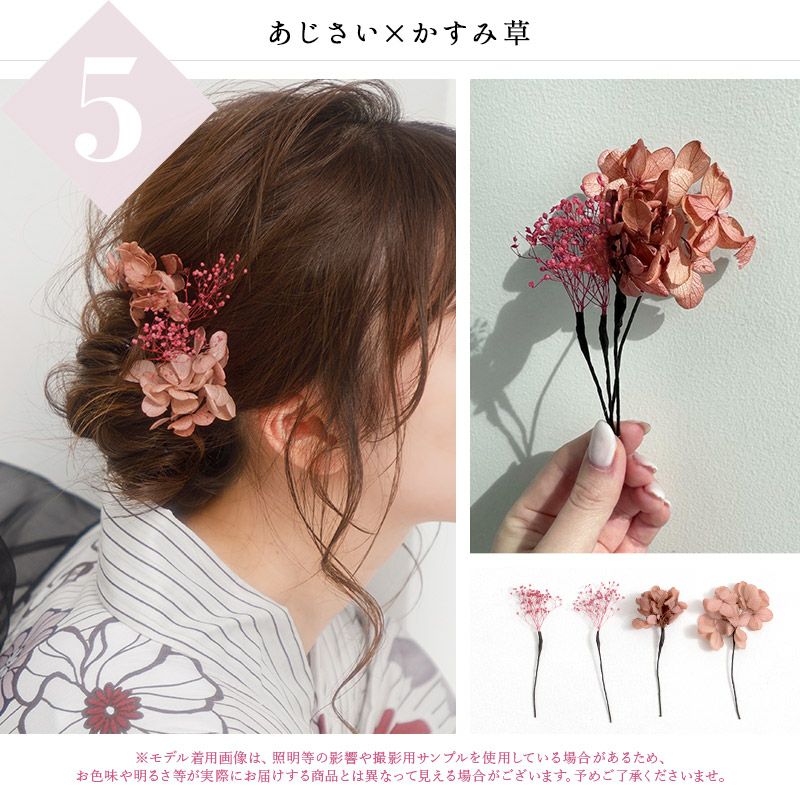 ドライフラワー髪飾り(4本セット) 5.あじさい×かすみ草