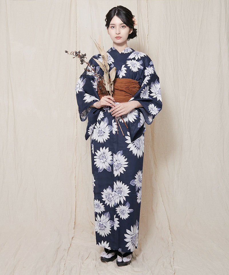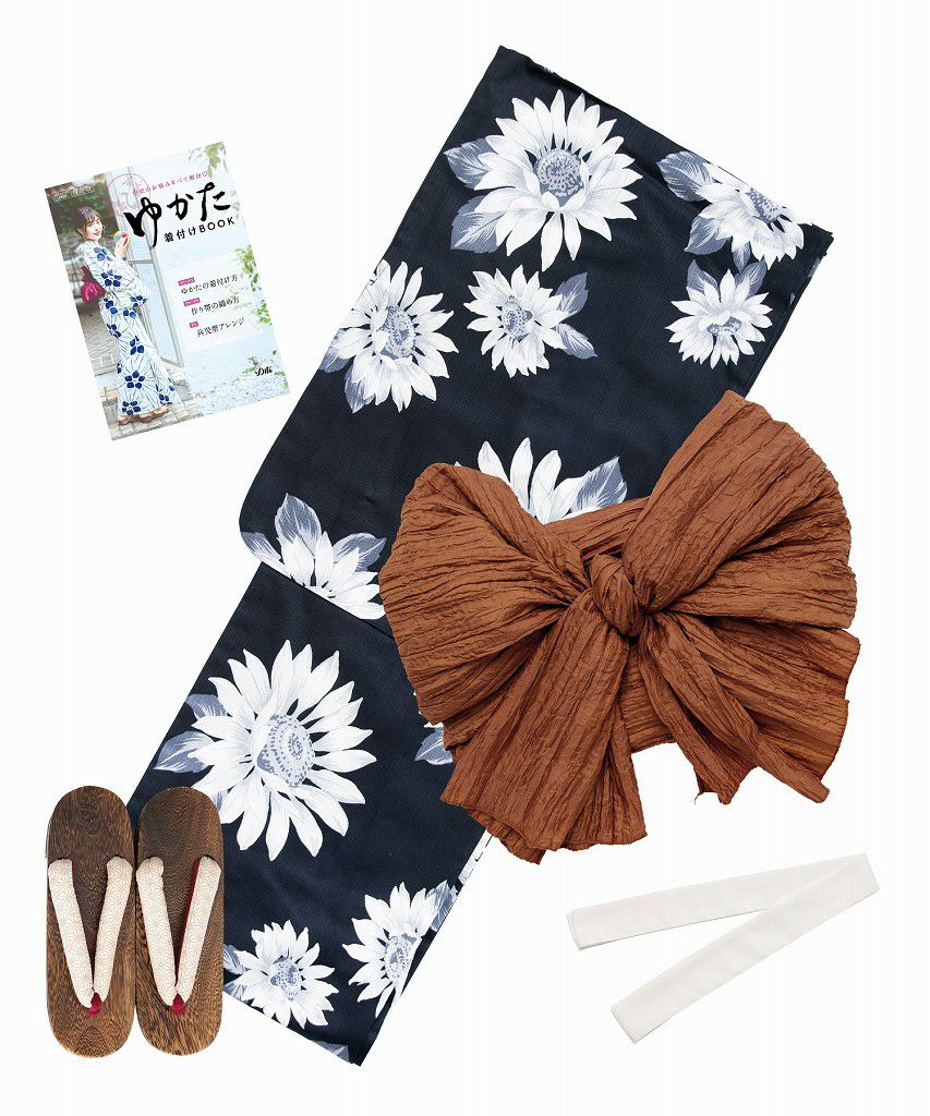 浴衣5点セット(ゆかた・帯・下駄・着付けマニュアル・腰ひも) 涼風の幻想ひまわり